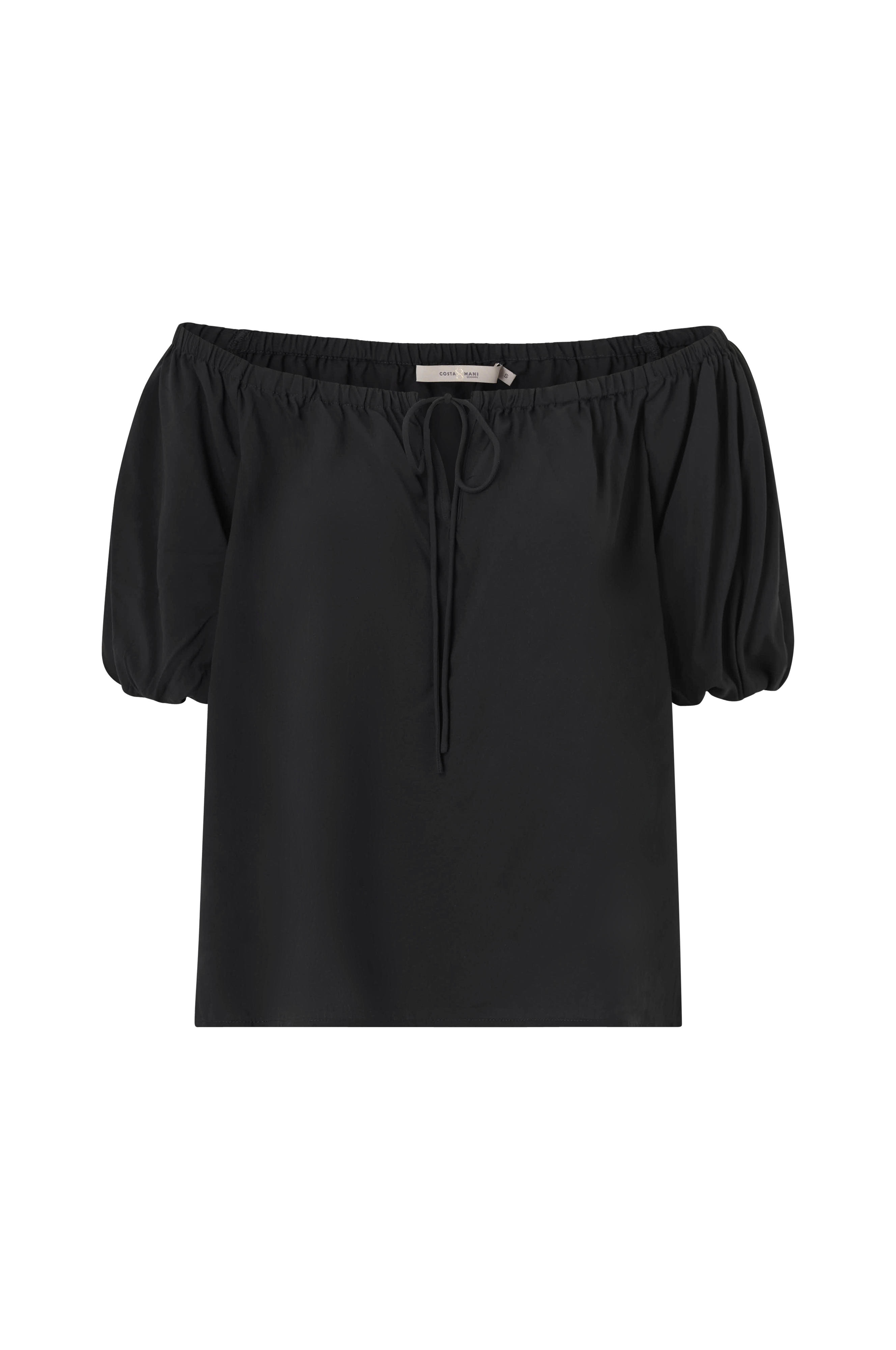 • Off-shoulder bluse i luftig viskose• Elastik på toppen• Slids ved fronten med bindebånd• Korte pufærmer med elastik ved manchetterne