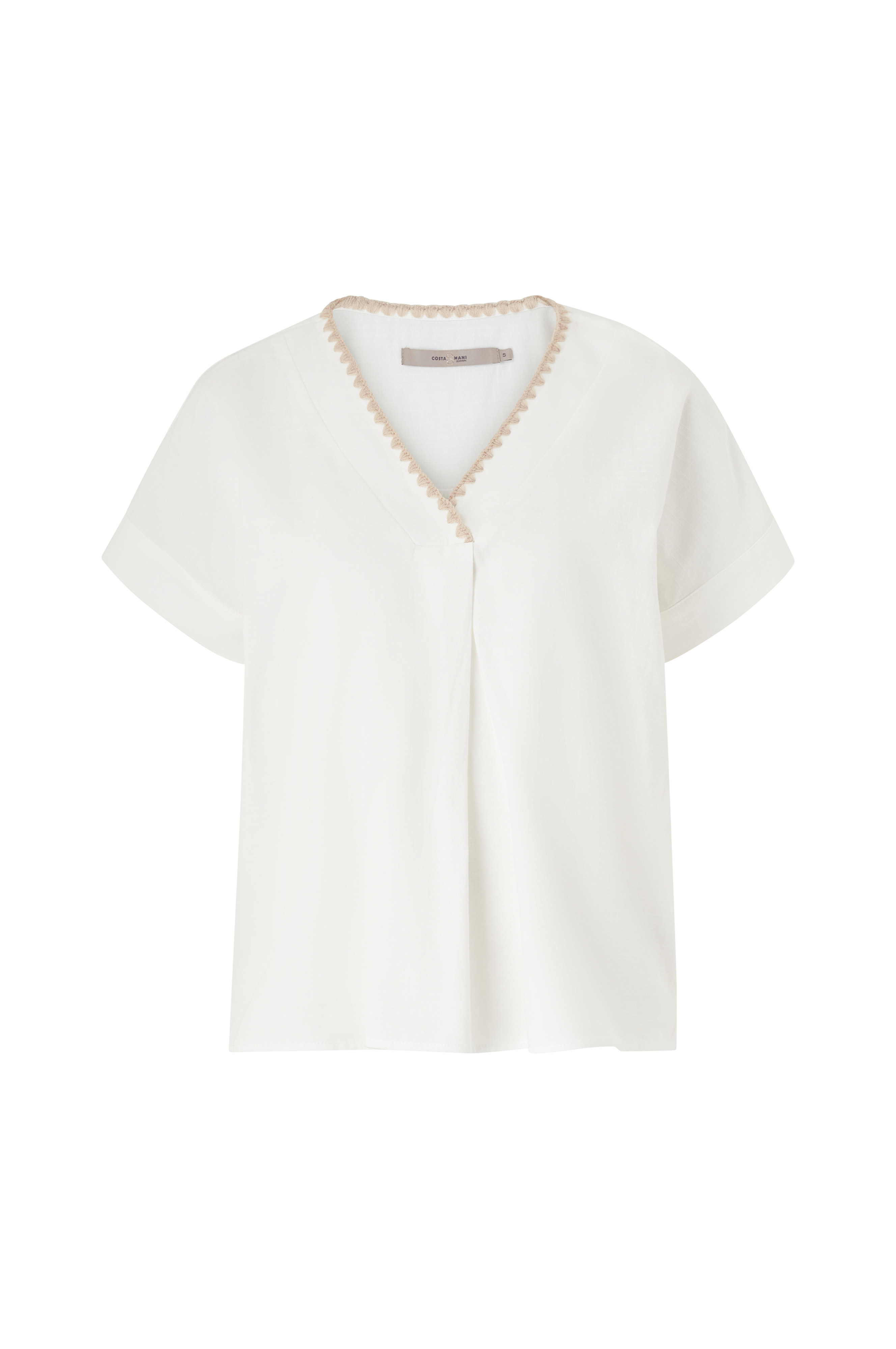 • Bred, lige model• V-formet halsudskæring med broderet kant og bokslæg på brystet• Nedsænket skulder med kort ærme• Korte slidser nede i siderne