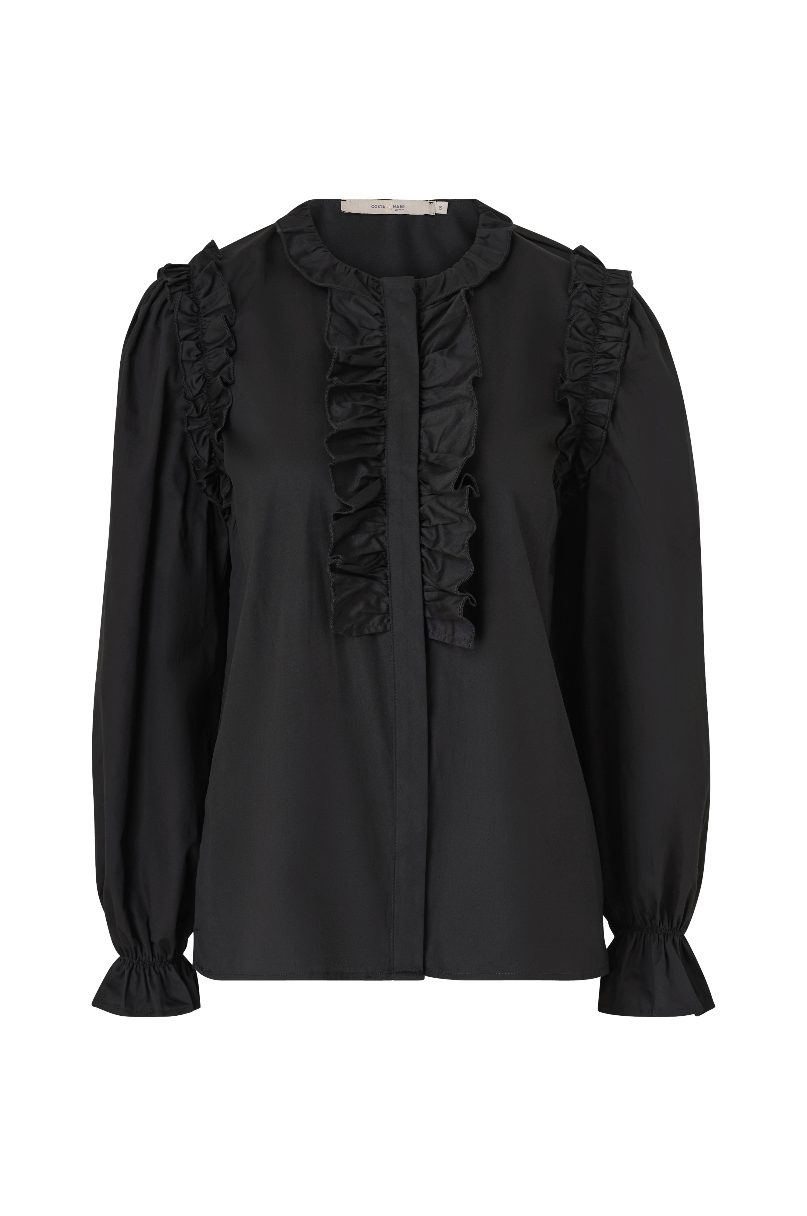 • Lige model med volanter i halsen, foran og over skuldrene• Skjulte knapper hele vejen frem• Ballonærme med elastiksøm nederst