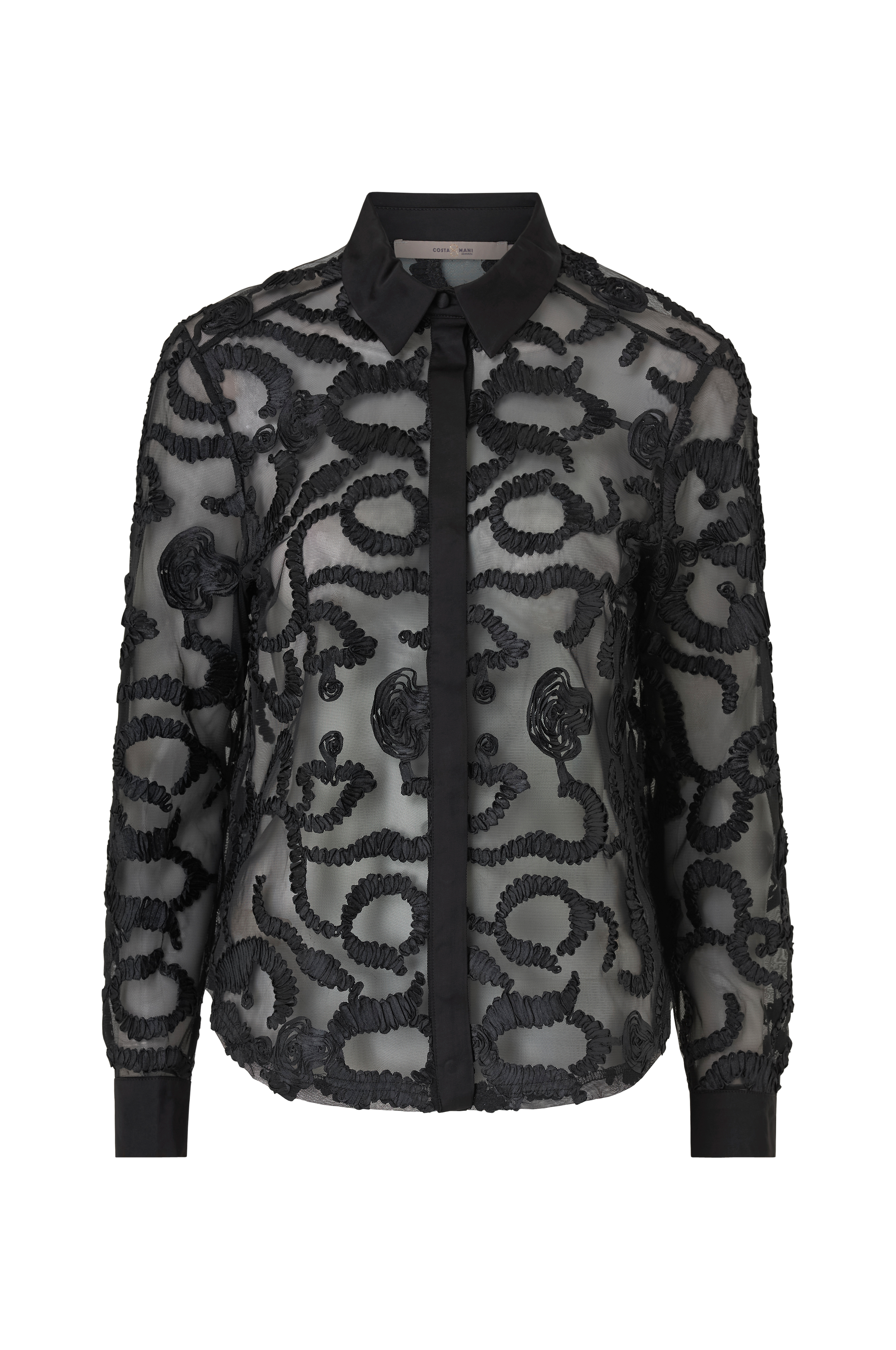 • Transparent model i mesh med applikationer• Skjortekrave i satin• Skjulte knapper foran• Langt ærme med manchet• Afrundet søm