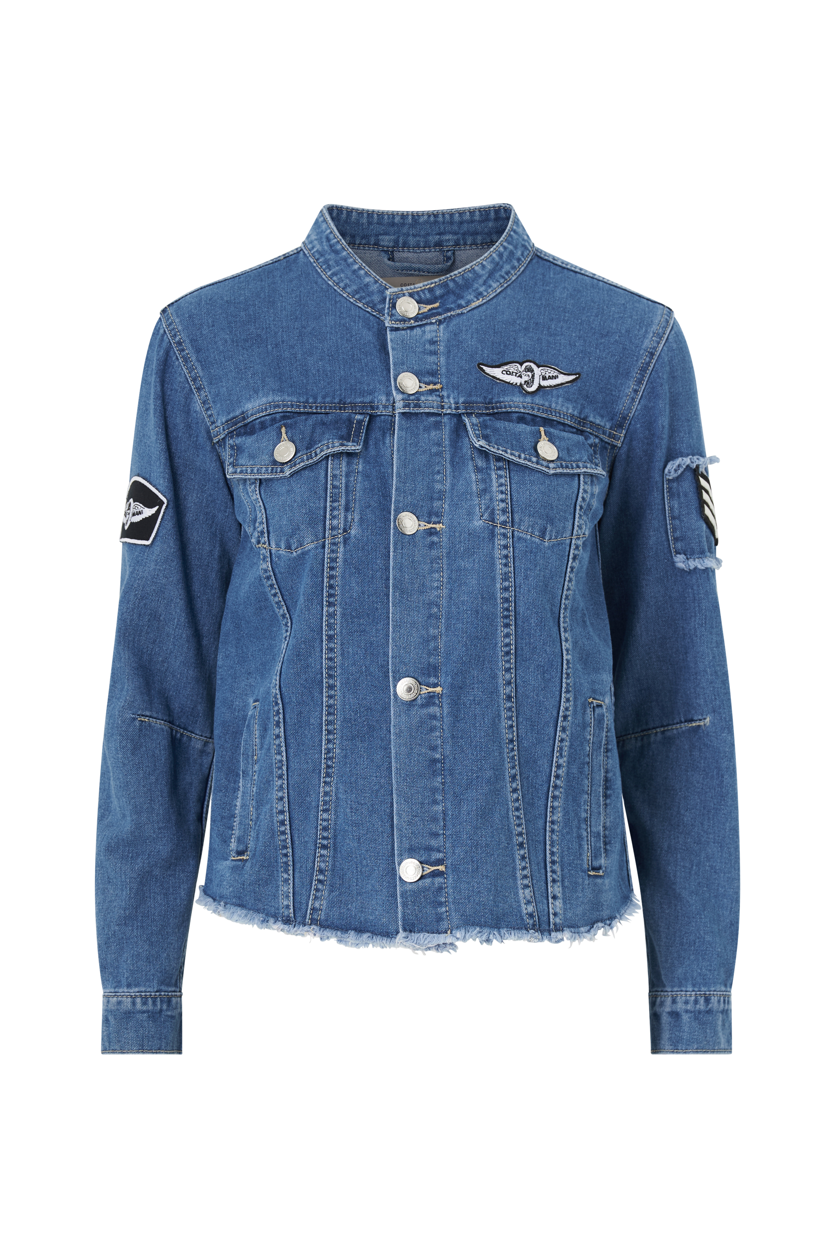 • Cowboyjakke med rund krave• Metalknapper• Påsyede patches på ærmerne og ved fronten• Rå søm• Lynlåse ved ærmeafslutningerne• Sidelommer• To brystlommer med påsyede lommelåg• Længde: 57 cm i størrelse S