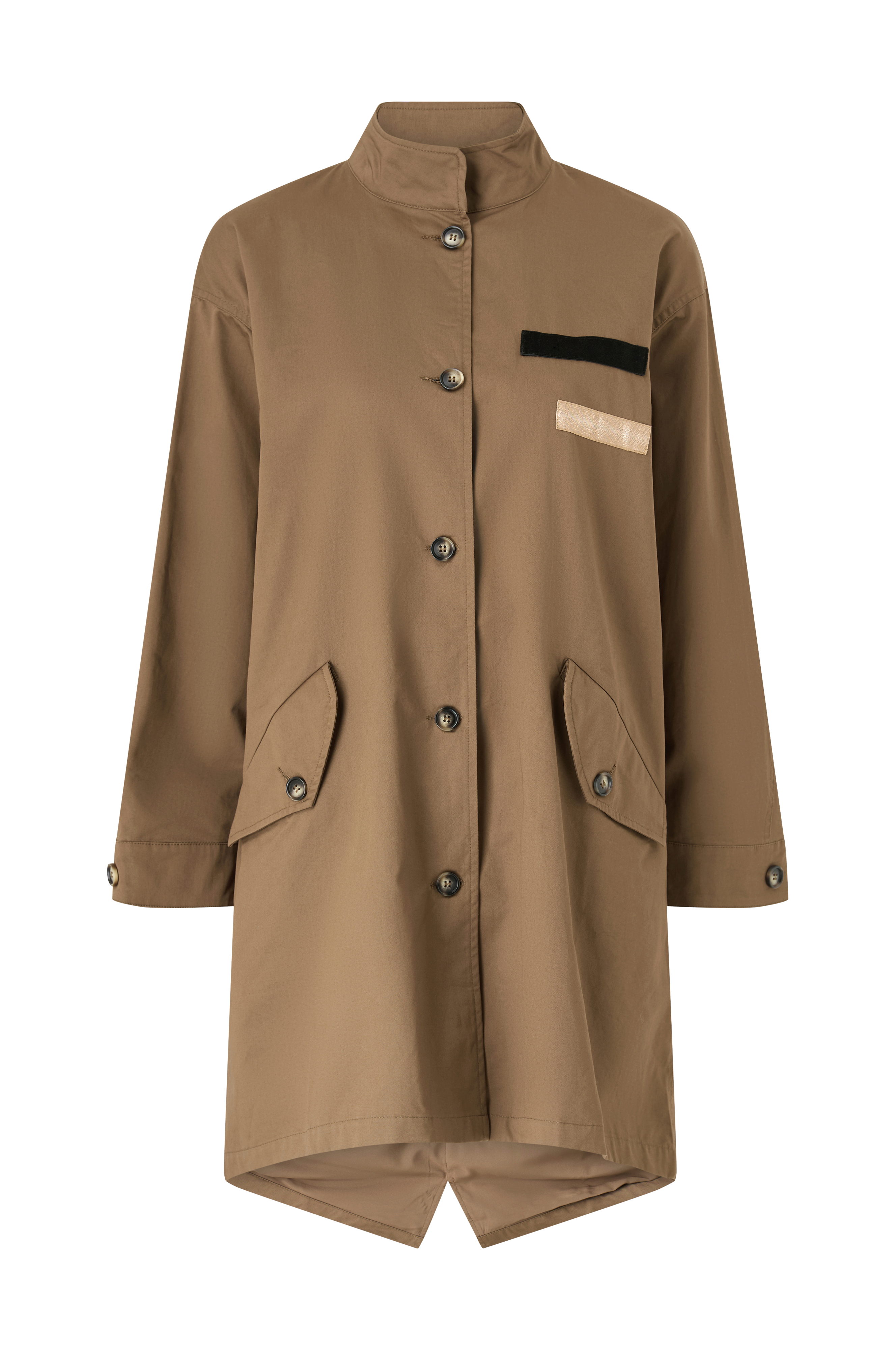• Frakke med dekorative lapper• Opretstående krave• Justérbare ærmeafslutninger• Knaplukning• Tekstilforing• To yderlommer med låg• Slids nede bagved• Længde: 95 cm i størrelse S