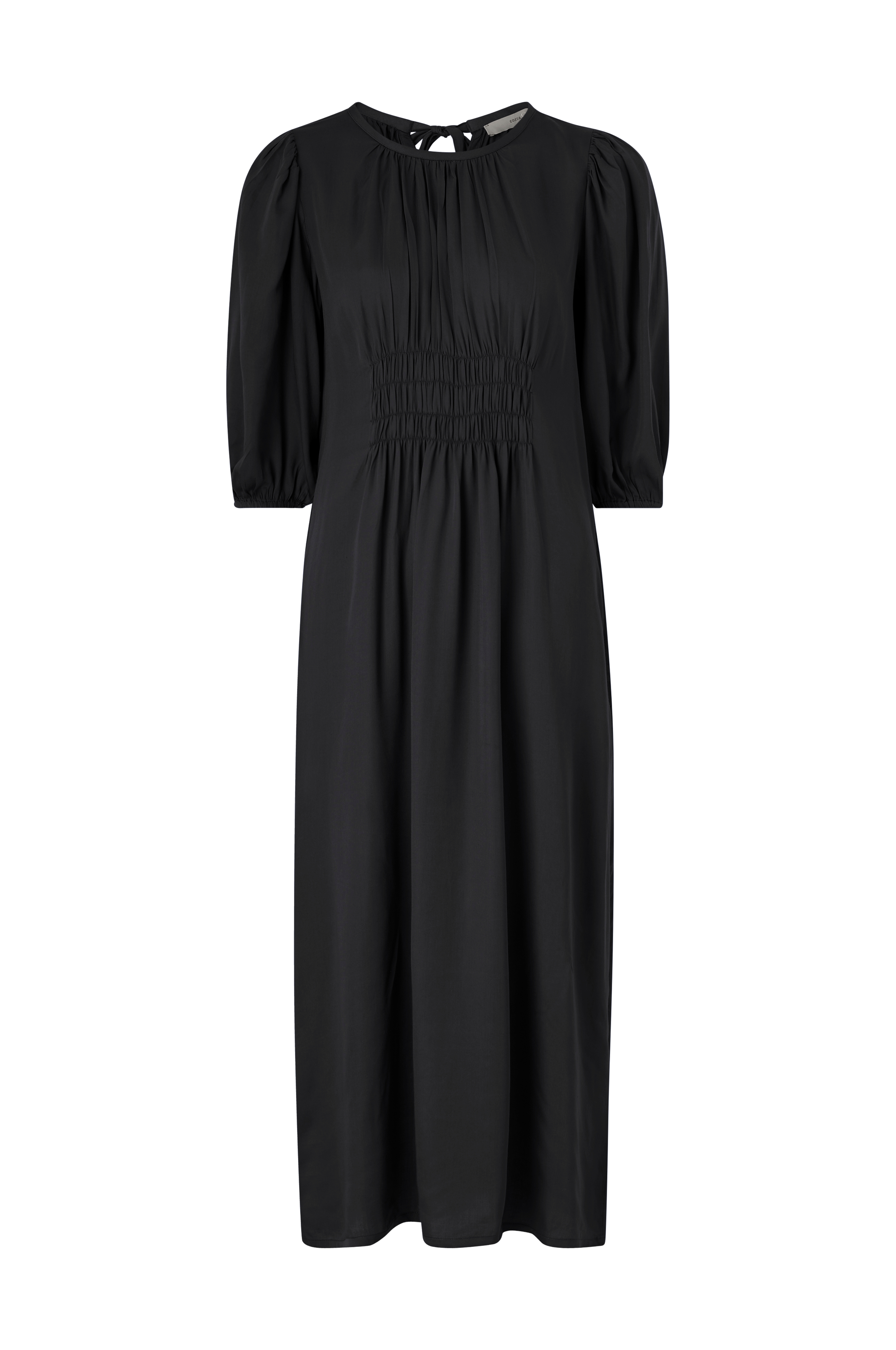 • Model med svaj med elastiksømme foran og bagpå• Rund hals med ventilation og bindebånd foran• Halvlangt, bredt ballonærme med elastik ved manchetterne• Sidelommer• Længde: 130 cm i størrelse S