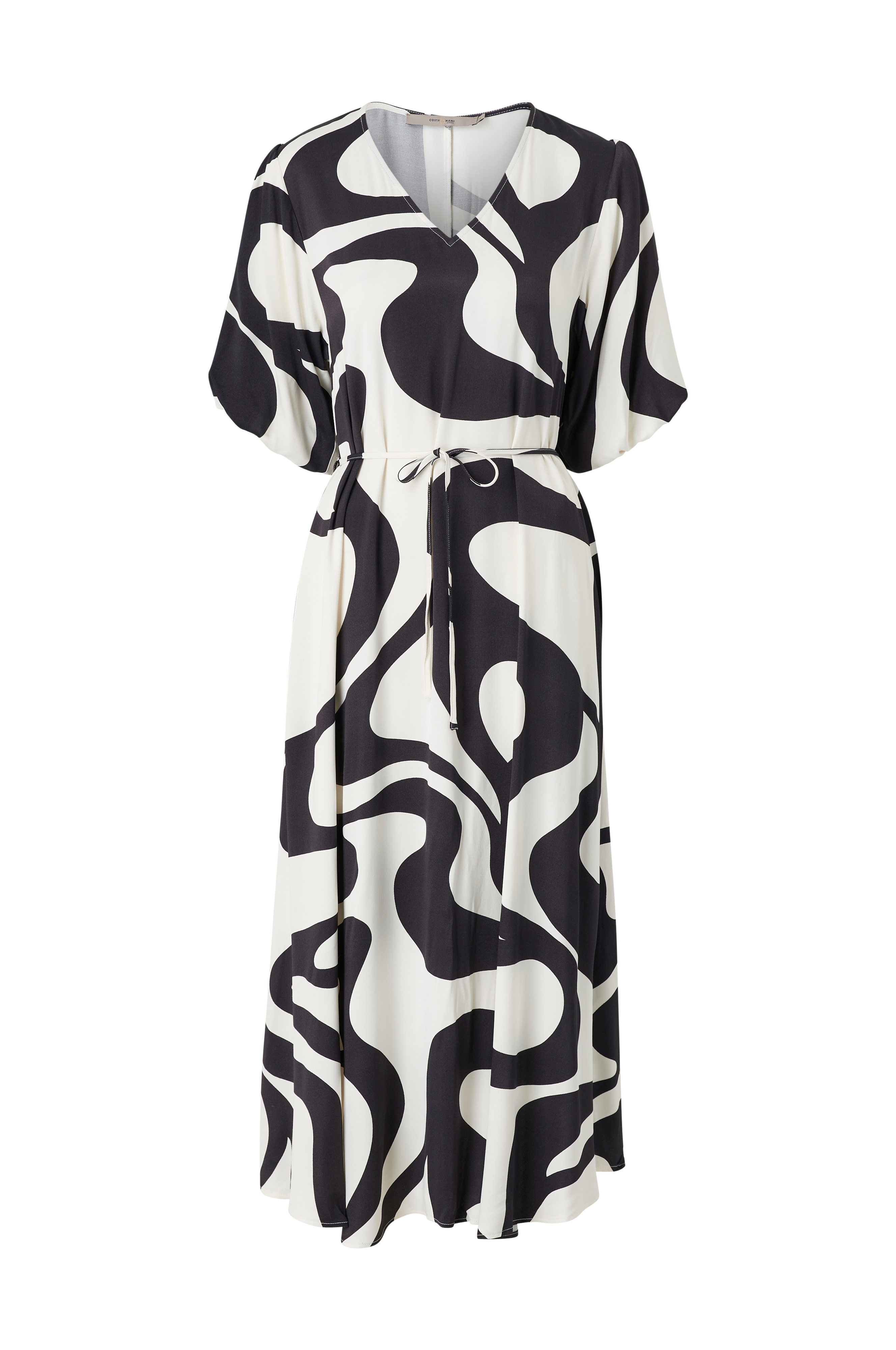 • Lang, mønstret kjole• V-udskæring• Korte ballonærmer• Tyndt bindebånd ved taljen• Model med svaj• Længde: 130 cm i størrelse S