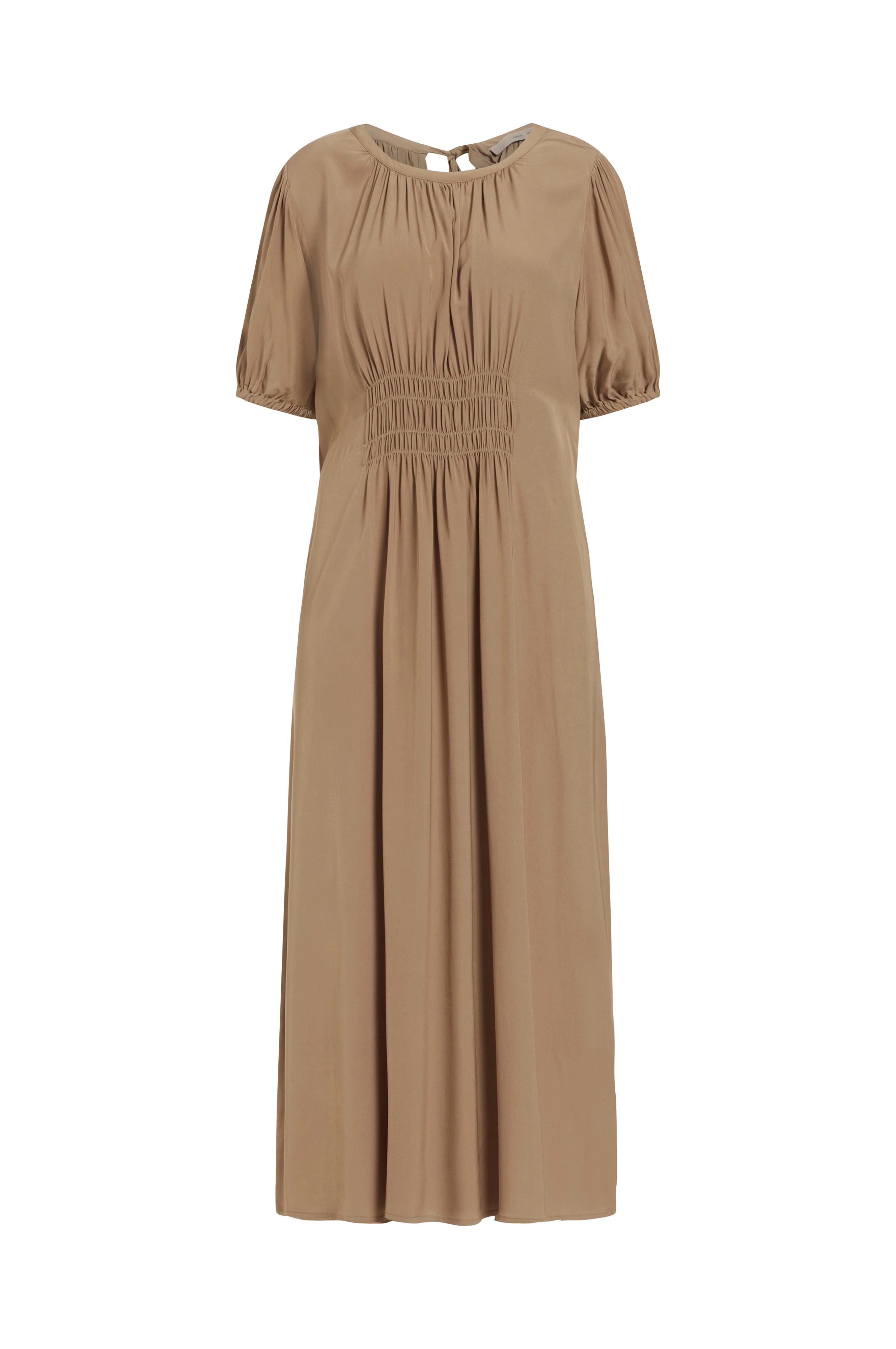 • Lige model i satin• Rund hals med samling og to bindebånd i nakken• Kort ballonærme med elastik ved manchetterne• Elastiksømme midt foran og bagpå ved taljen• Indlagte sidelommer• Længde: 130 cm i størrelse S