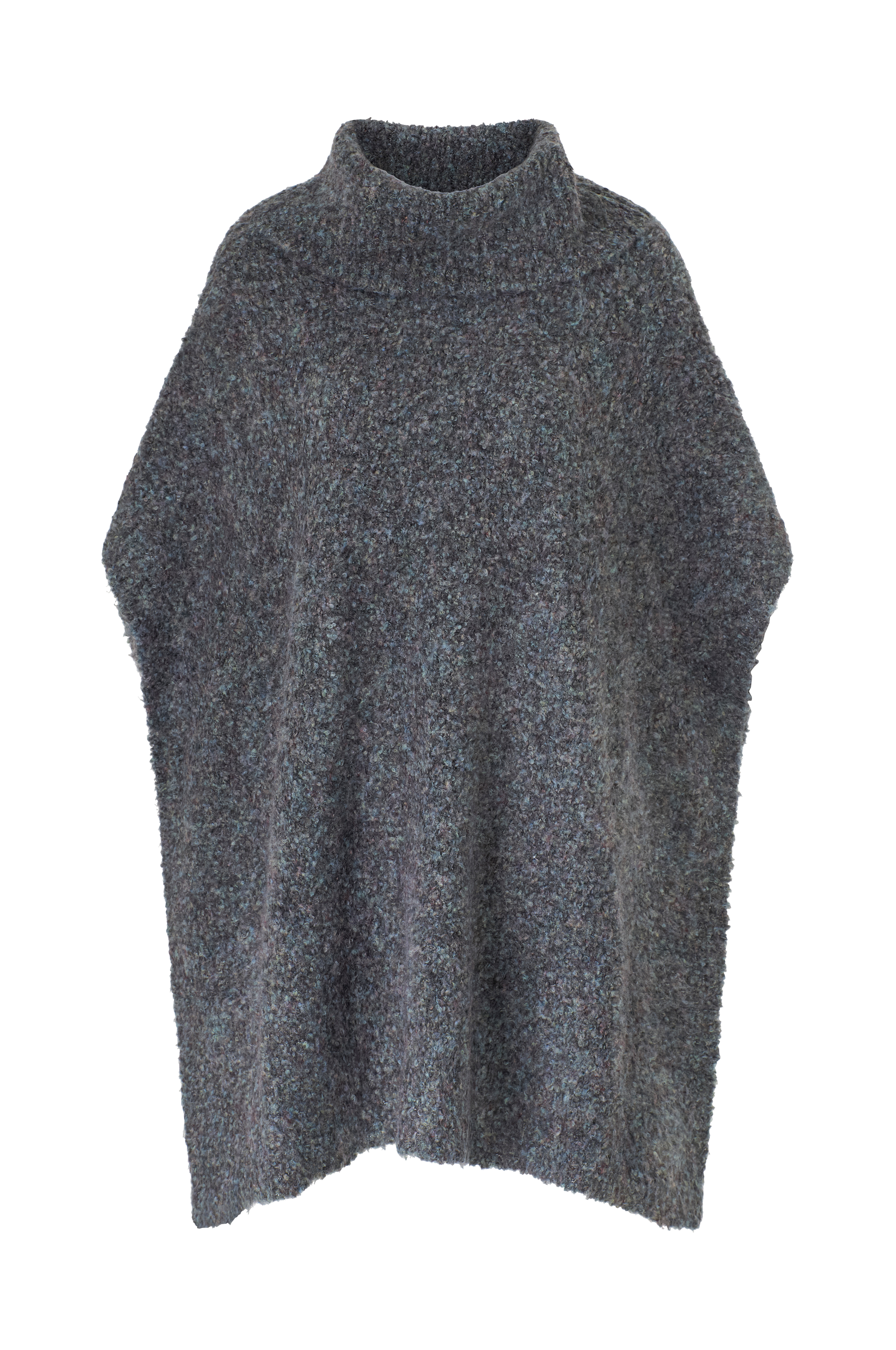 • Lang, strikket poncho• Høj, nedadvendt krave