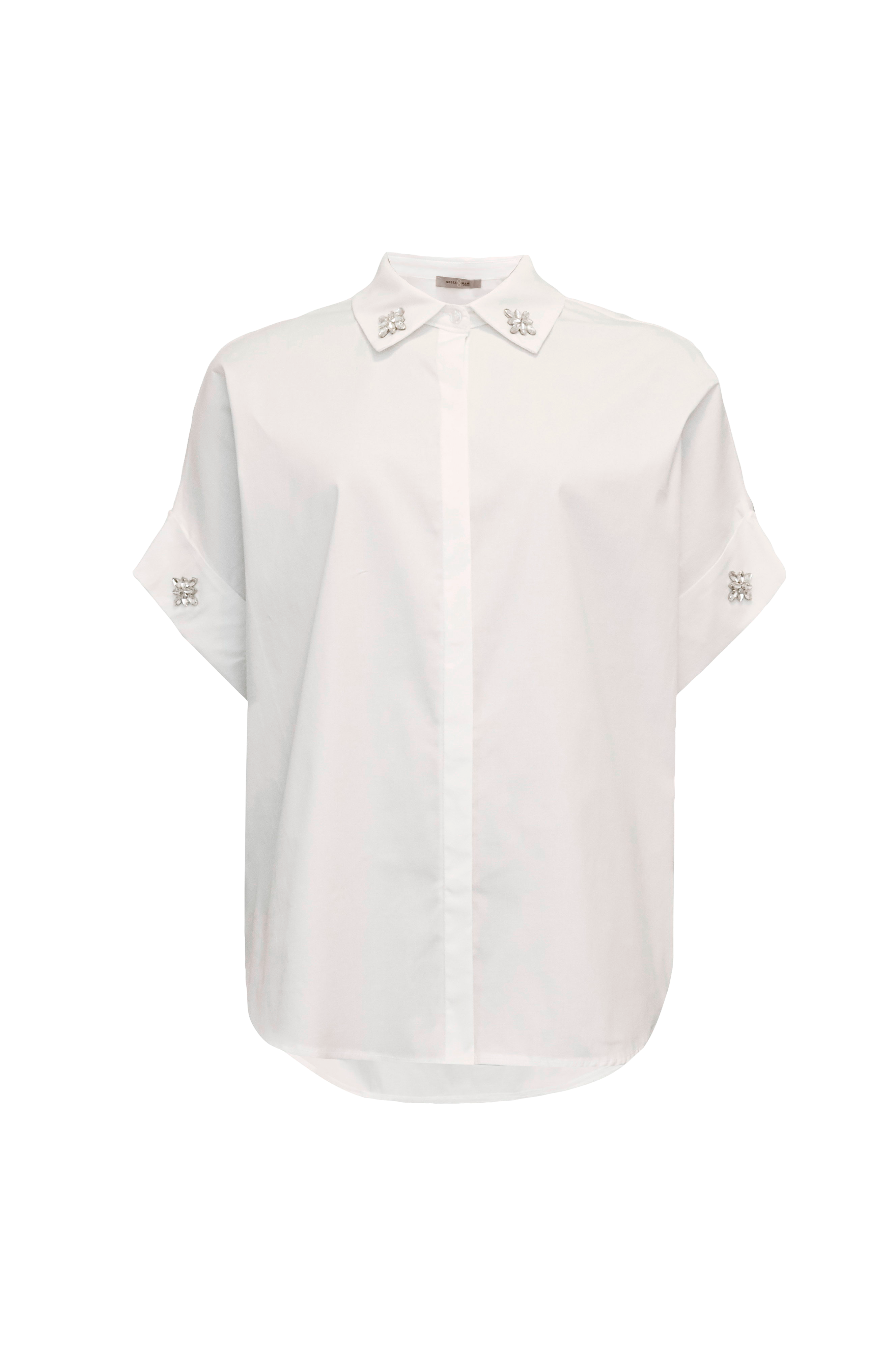 • Kortærmet skjorte• Skjult knaplukning• Dekorative rhinstene• Afrundet søm med lidt længere bagside