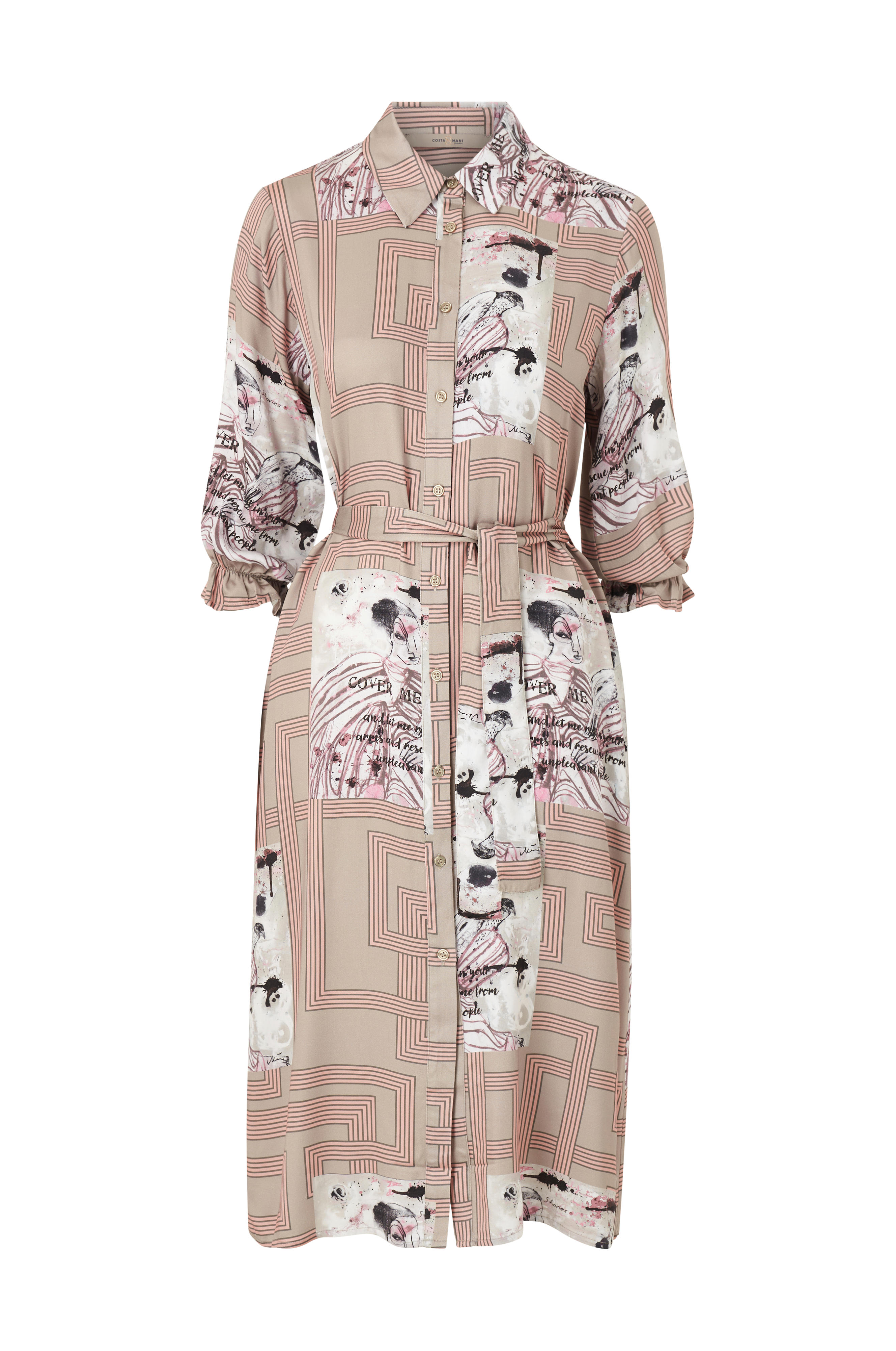• Skjortekjole i blød, luftig viskose med printet mønster• 3/4 lange ærmer med elastik og kort flæsekant ved ærmeafslutningerne• Skjortekrave med knapstolpe langs forsiden• Bindebånd ved taljen• Lommer i siderne• Længde: 116 cm i størrelse S