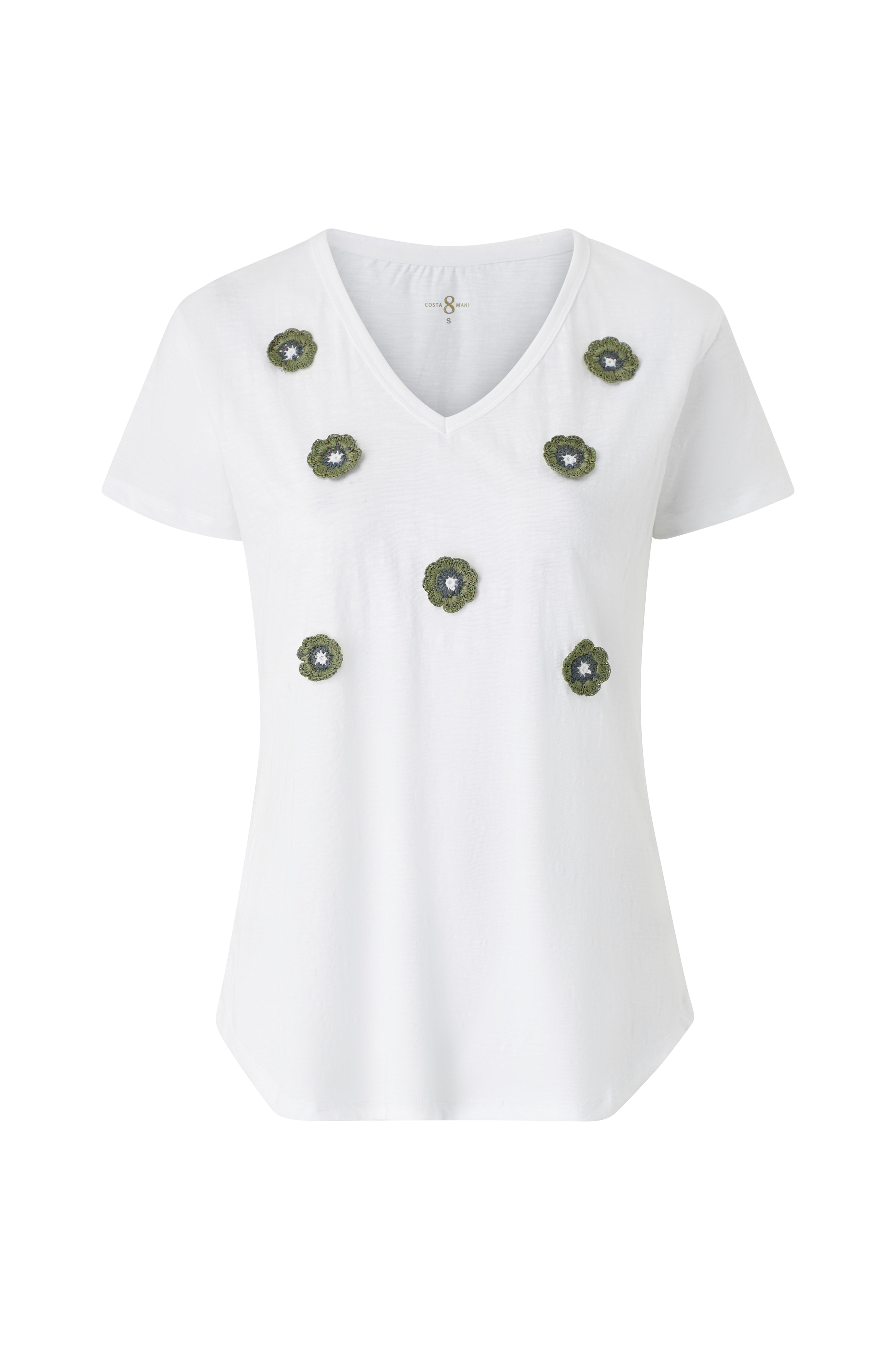 • Let figursyet model• V-formet halsudskæring• Hæklede applikationer på brystet• Kort ærme• Afrundet søm