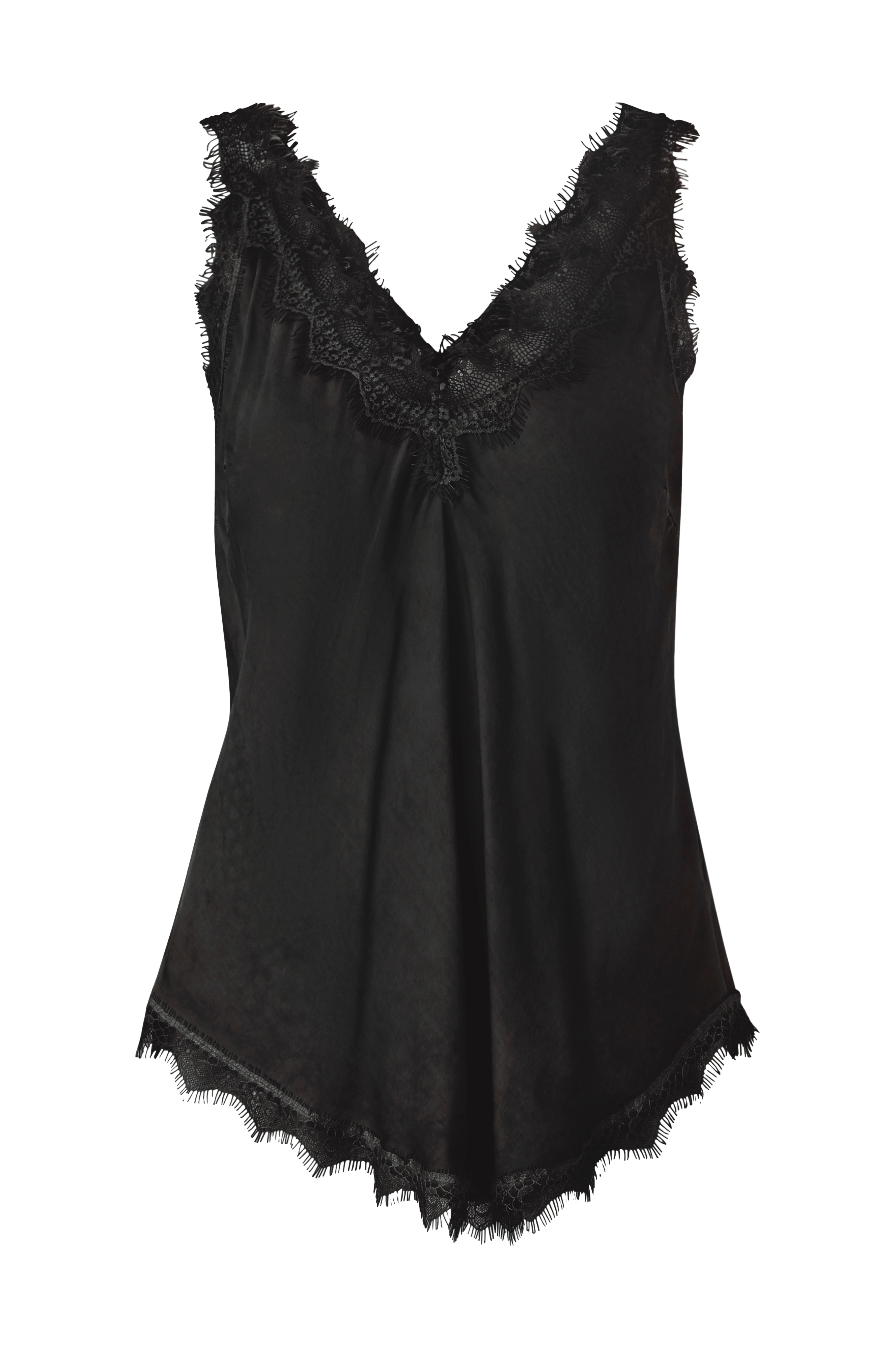 • Ærmeløs model i satin med blondekanter• V-udskæring foran og bagpå• Afrundet søm