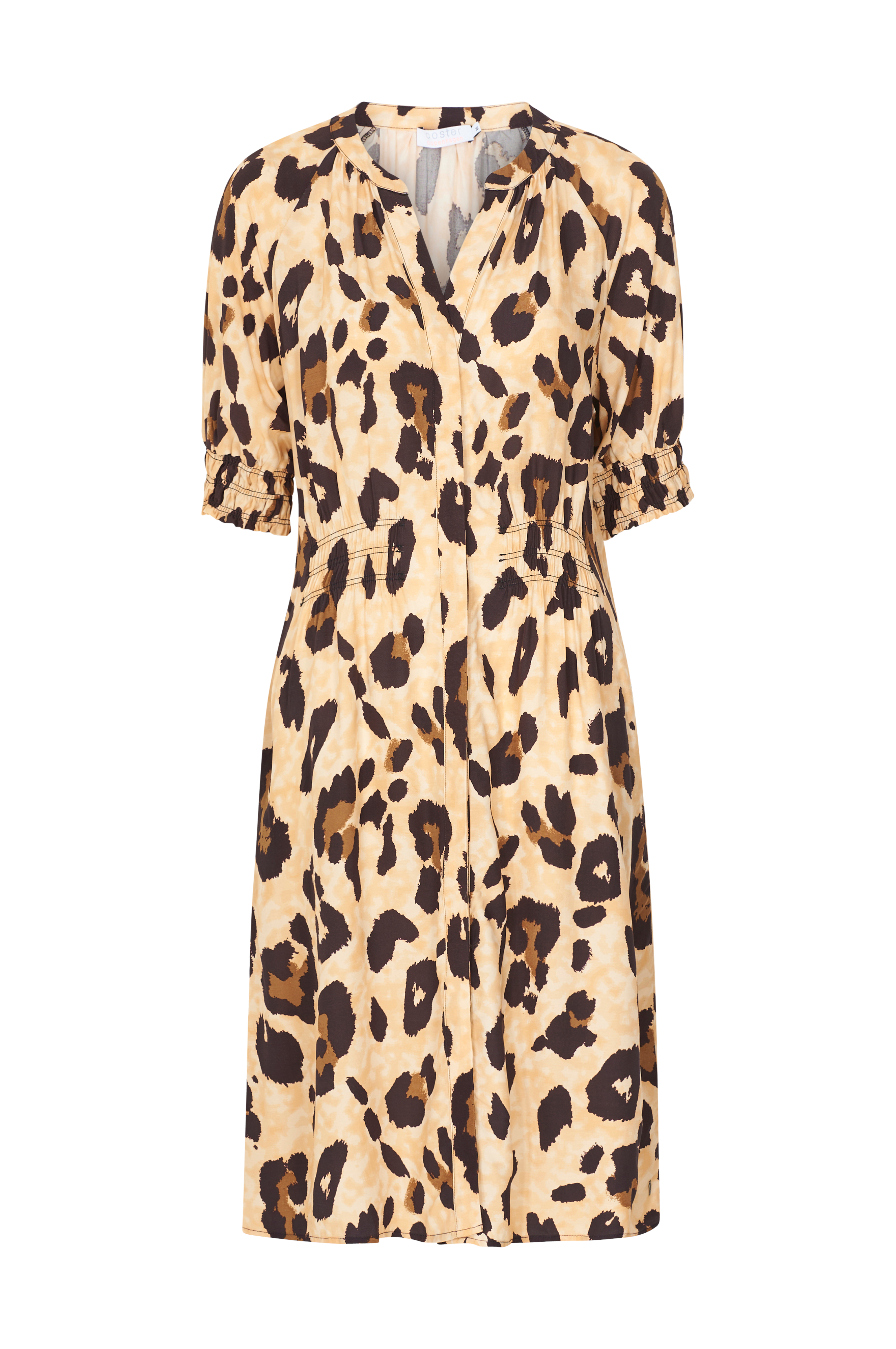 Kjole med v-udskæring med skjulte knapper foran og markeret talje med smock. Halvlange raglanærmer med smock i ærmekanten. Lommer i siderne. Længde ca. 110 cm i str. 36.