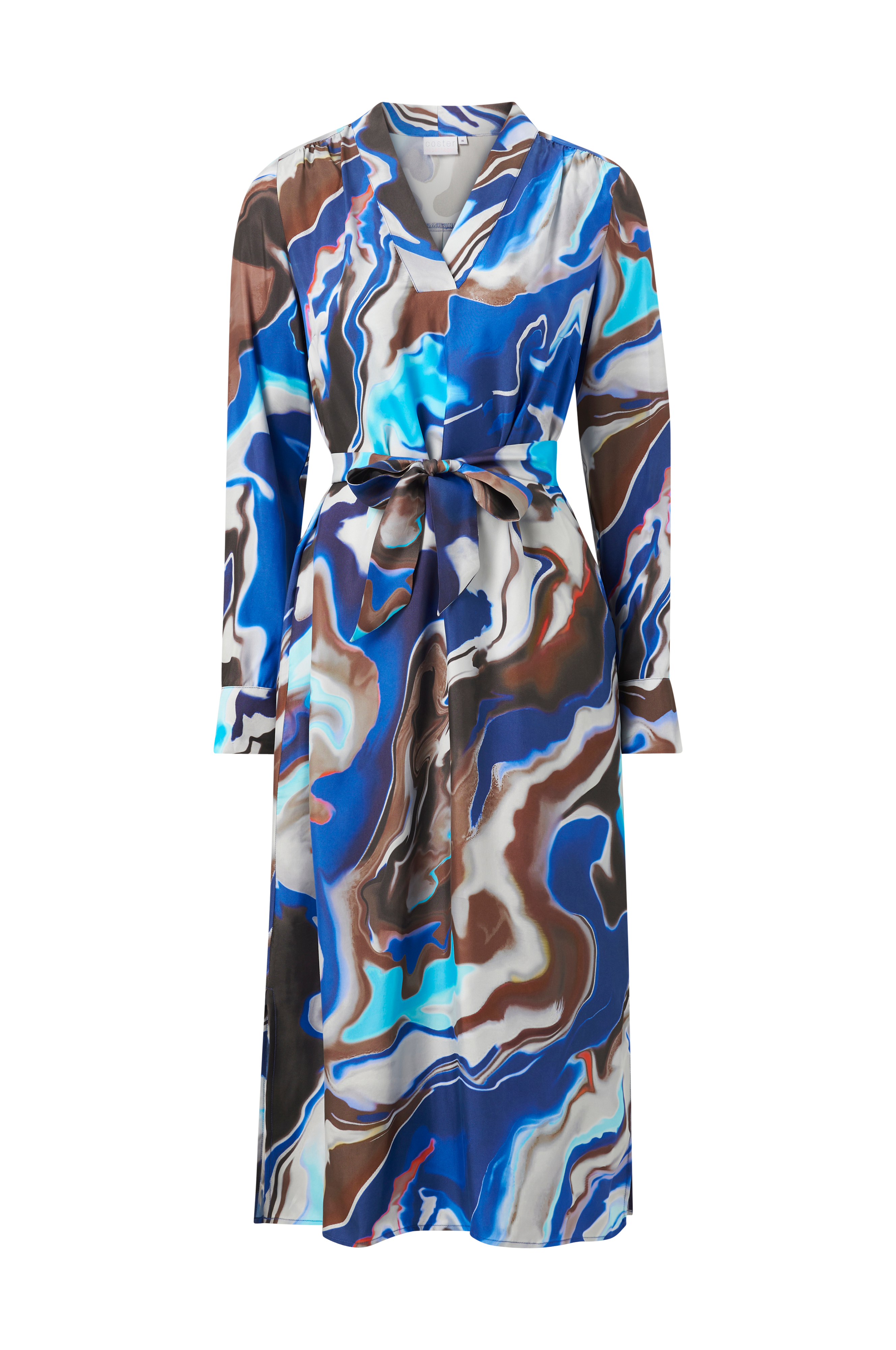 • Lang model med vidde og bindebælte• V-formet halsudskæring• Langt ærme med manchet• Indlagte sidelommer• Slids nede i siderne• Fremstillet af mønstret satin• Længde: 121 cm i størrelse 36