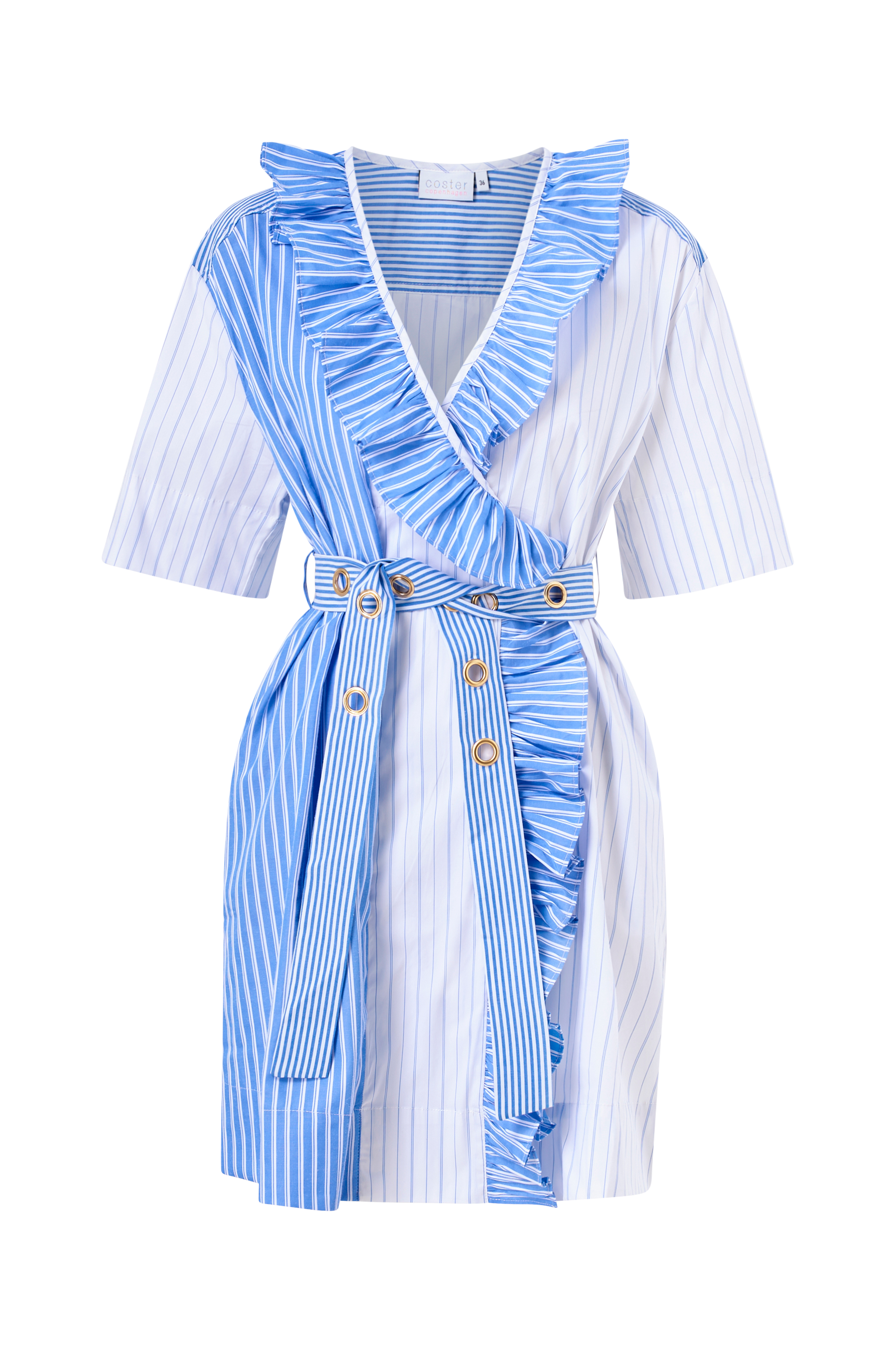 Kort kjole med flæser i v-udskæringen og korte ærmer. Flettet bindebånd med dekorative ringe i taljen. Flæse foran. Lige pasform. Længde ca. 91 cm i str. 36.