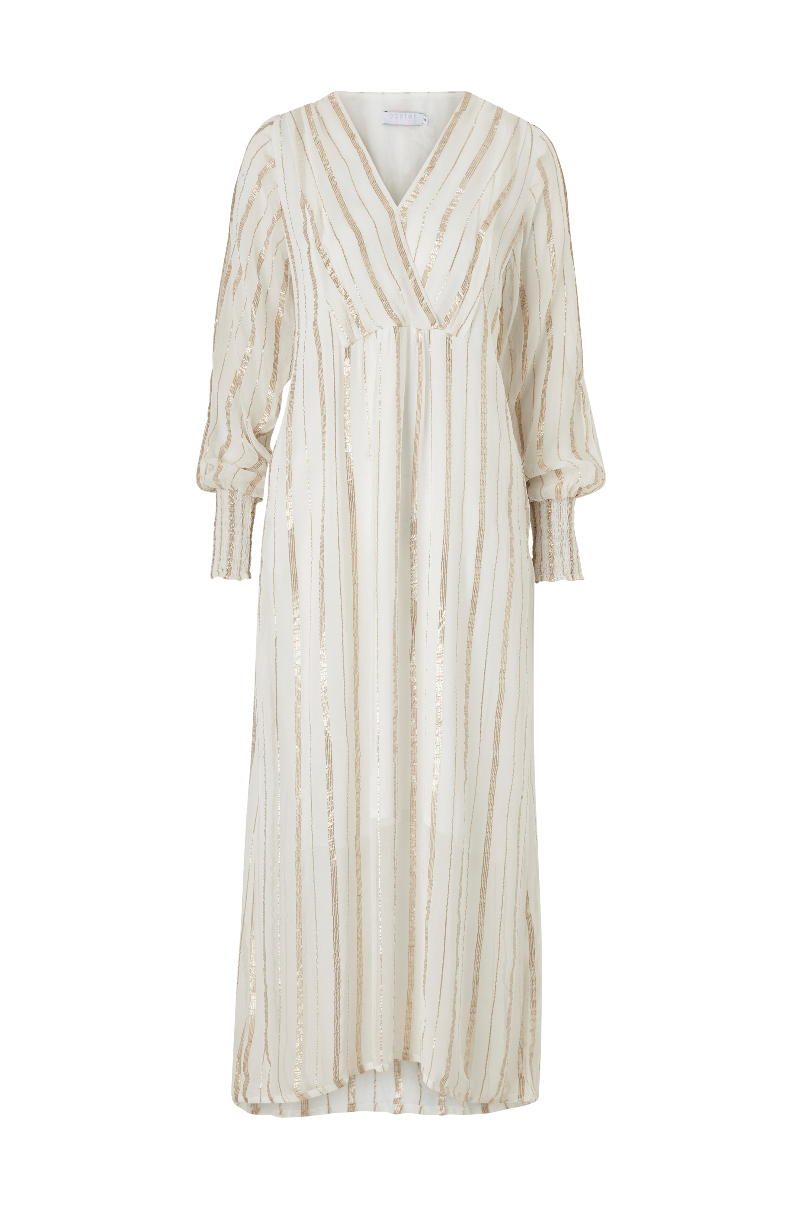• Model i chiffon • Slå-om design oppe foran • Langt, bredt ærme med bred, elastisk smock ved manchetterne • Indlagt elastik bagpå ved taljen • Foret • Længde: 136 cm i størrelse 36