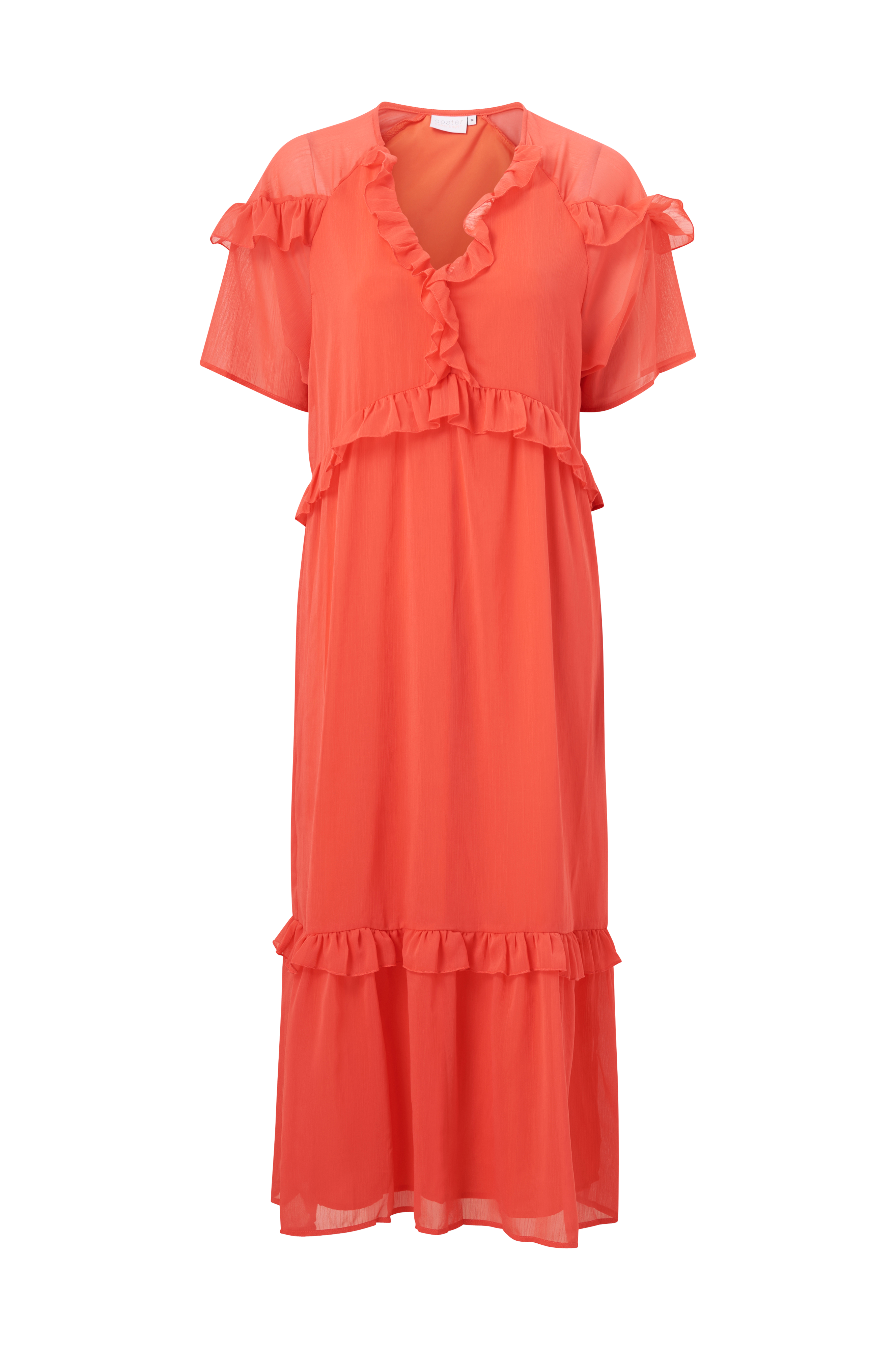 • Lang kjole i chiffon• V-udskæring med volant• Korte ærmer• Volant på ærmerne, under brystet og nederst• Vævet for• Længde: 131 cm i størrelse 36