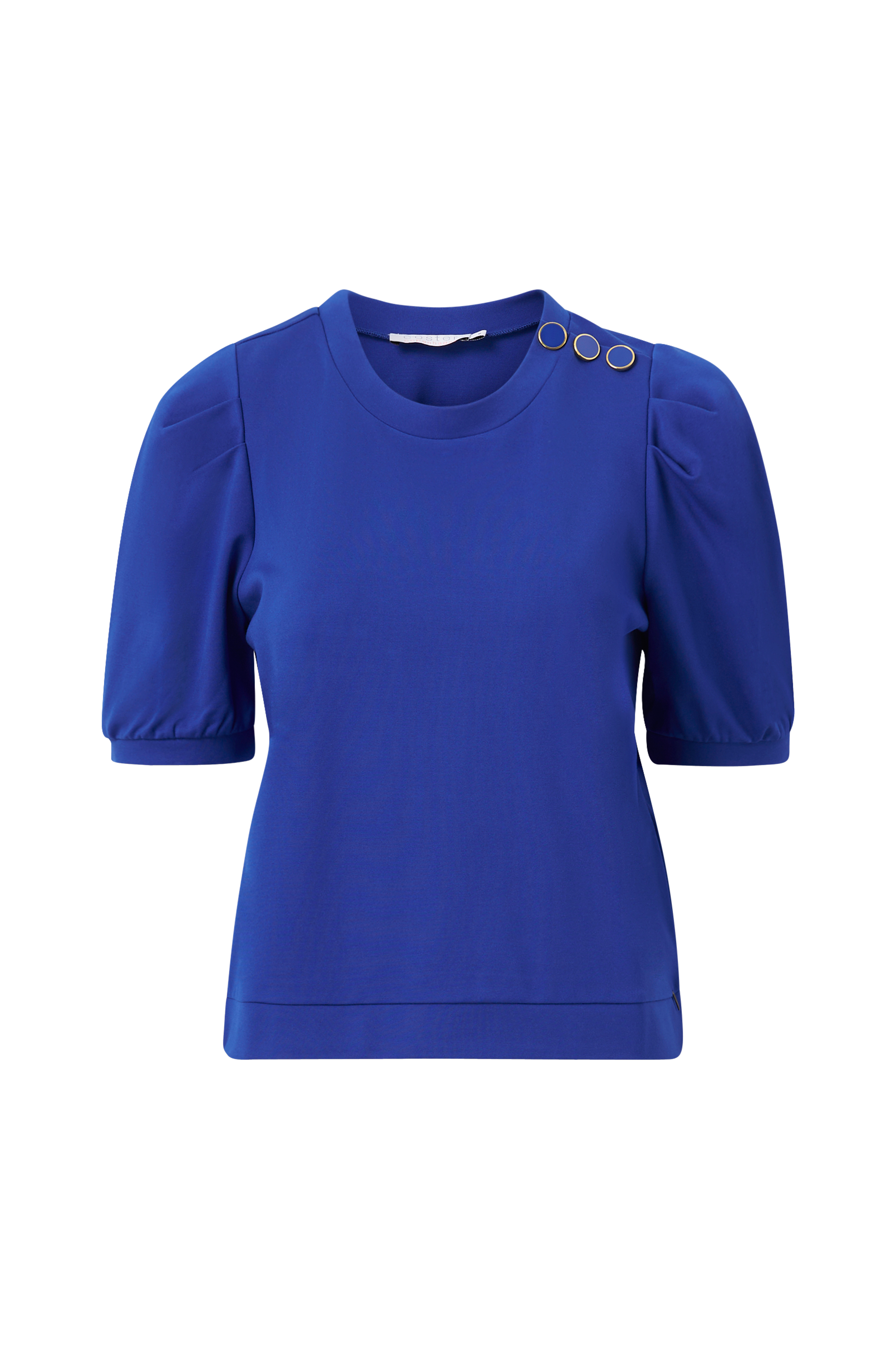 • Lige, bred model• Rund hals• Dekorationsknapper på en skulder• Kort ballonærme med kant ved manchetterne• Påsyet kant nederst