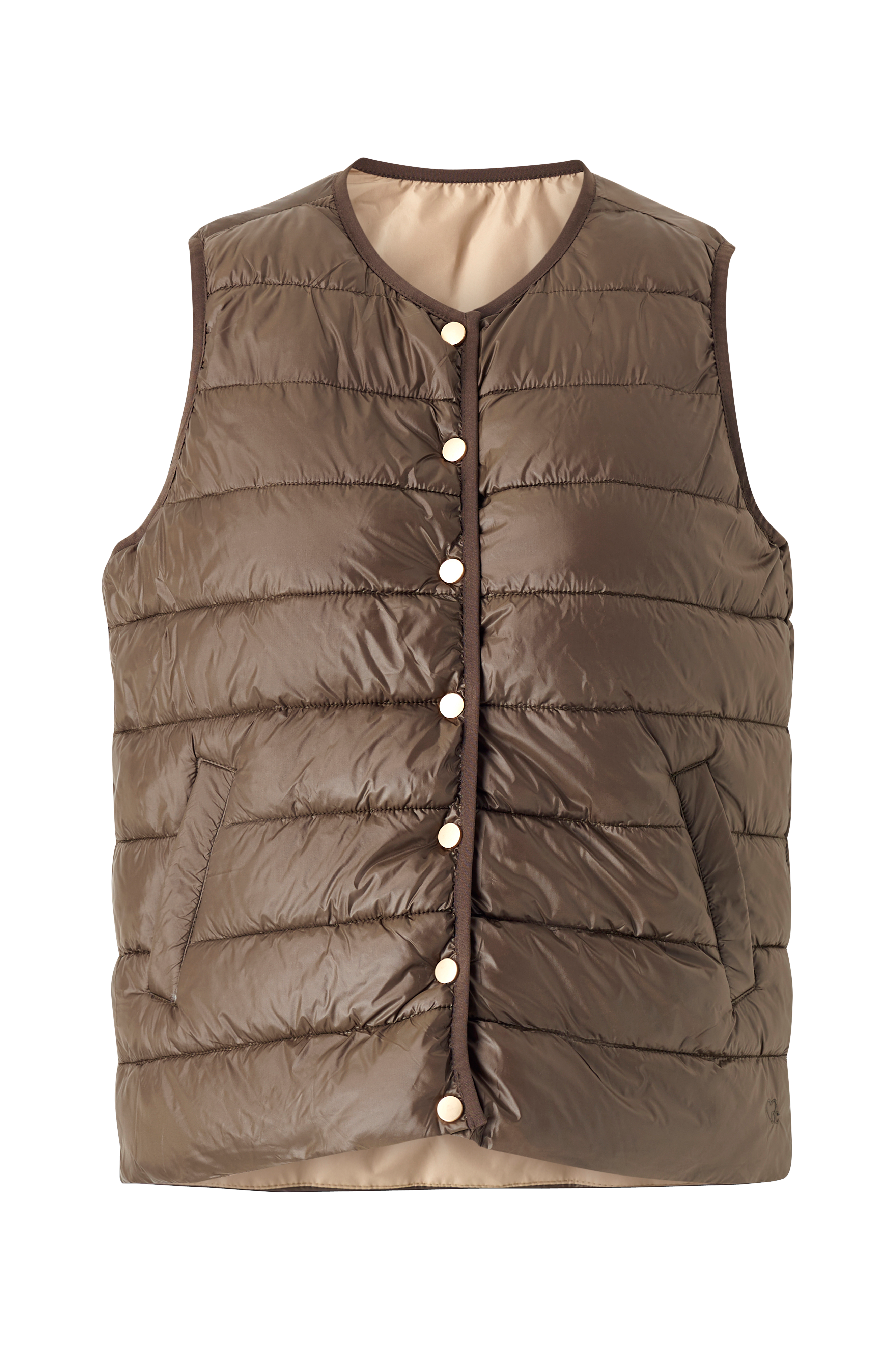 • Foret, vendbar vest• Trykknapper• To lommer• Elastiske kanter omkring ærmeåbningerne og rundt om halsen• Quiltet mønster på den ene side• Vævet, glat stof på den anden side