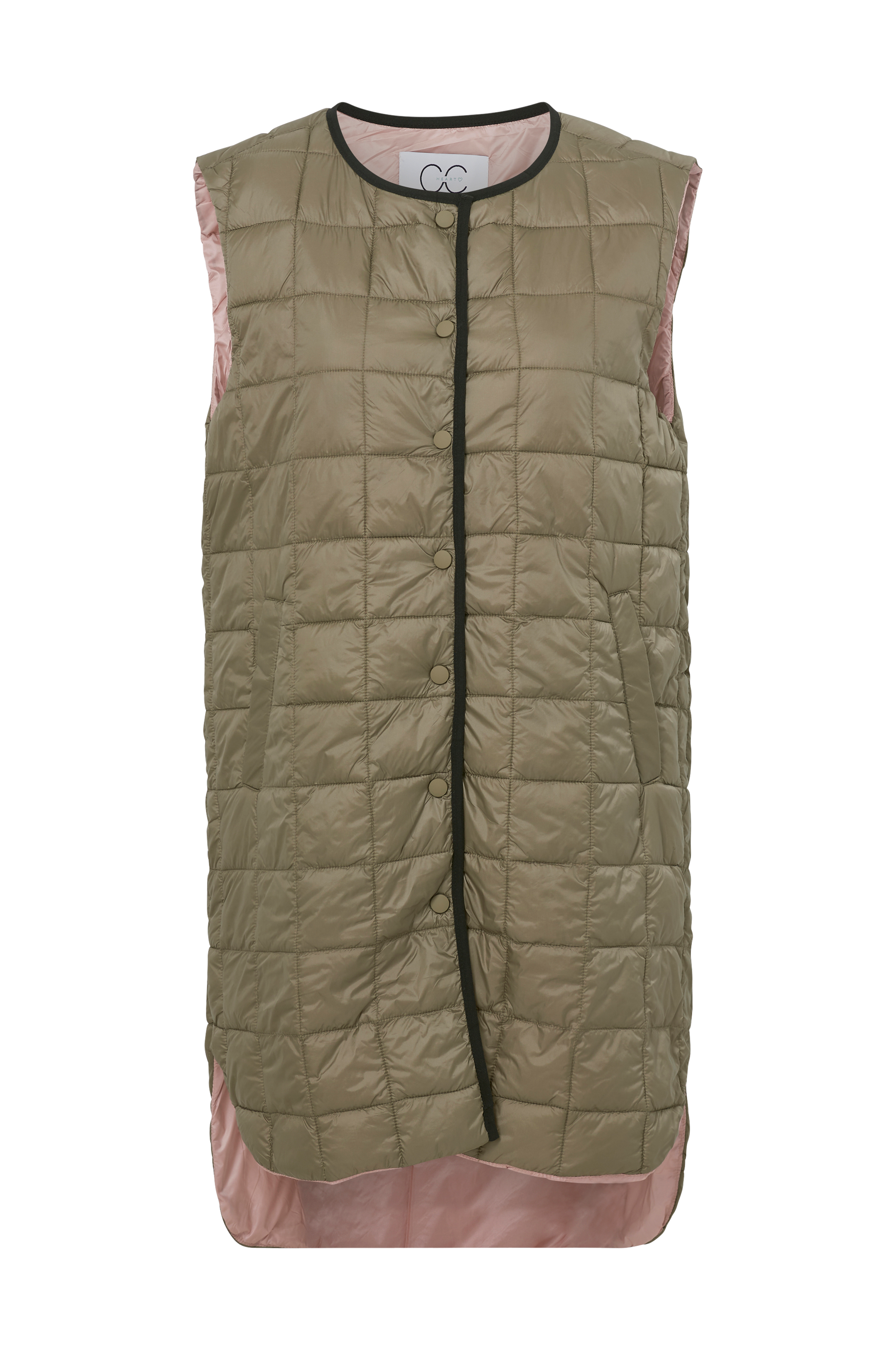 Quiltet og let vatteret vest i lang model med rund halsudskæring og trykknapper. Lommer i siderne. Længde bagpå ca. 99 cm i str. 36.