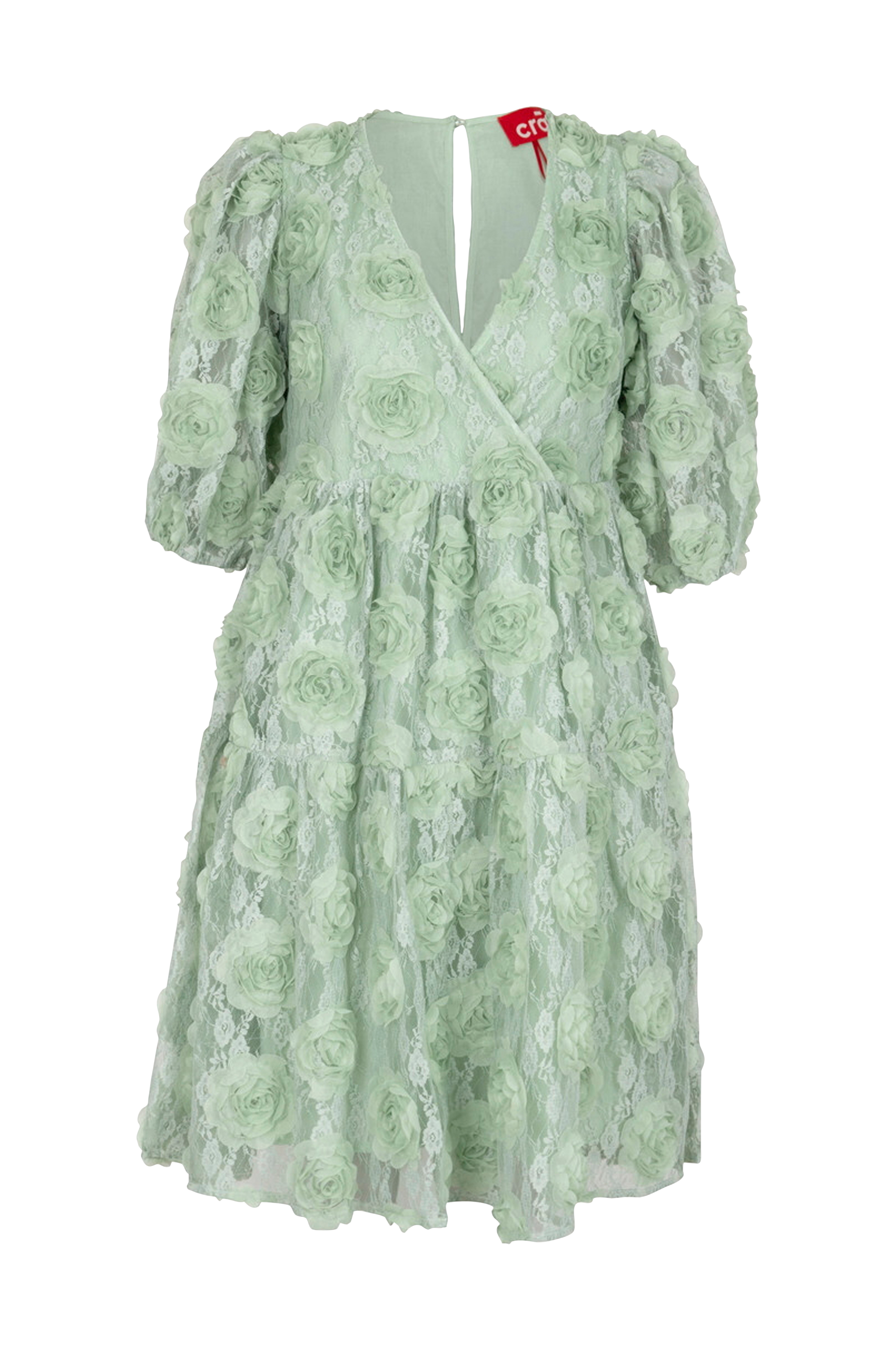 • Model i mesh med blomstrede applikationer overalt• Slå-om design oppe foran• Ventilation med knap i nakken• Halvlangt ballonærme med elastik ved manchetterne• Rynket talje• Foret• Længde: 94 cm i størrelse 36