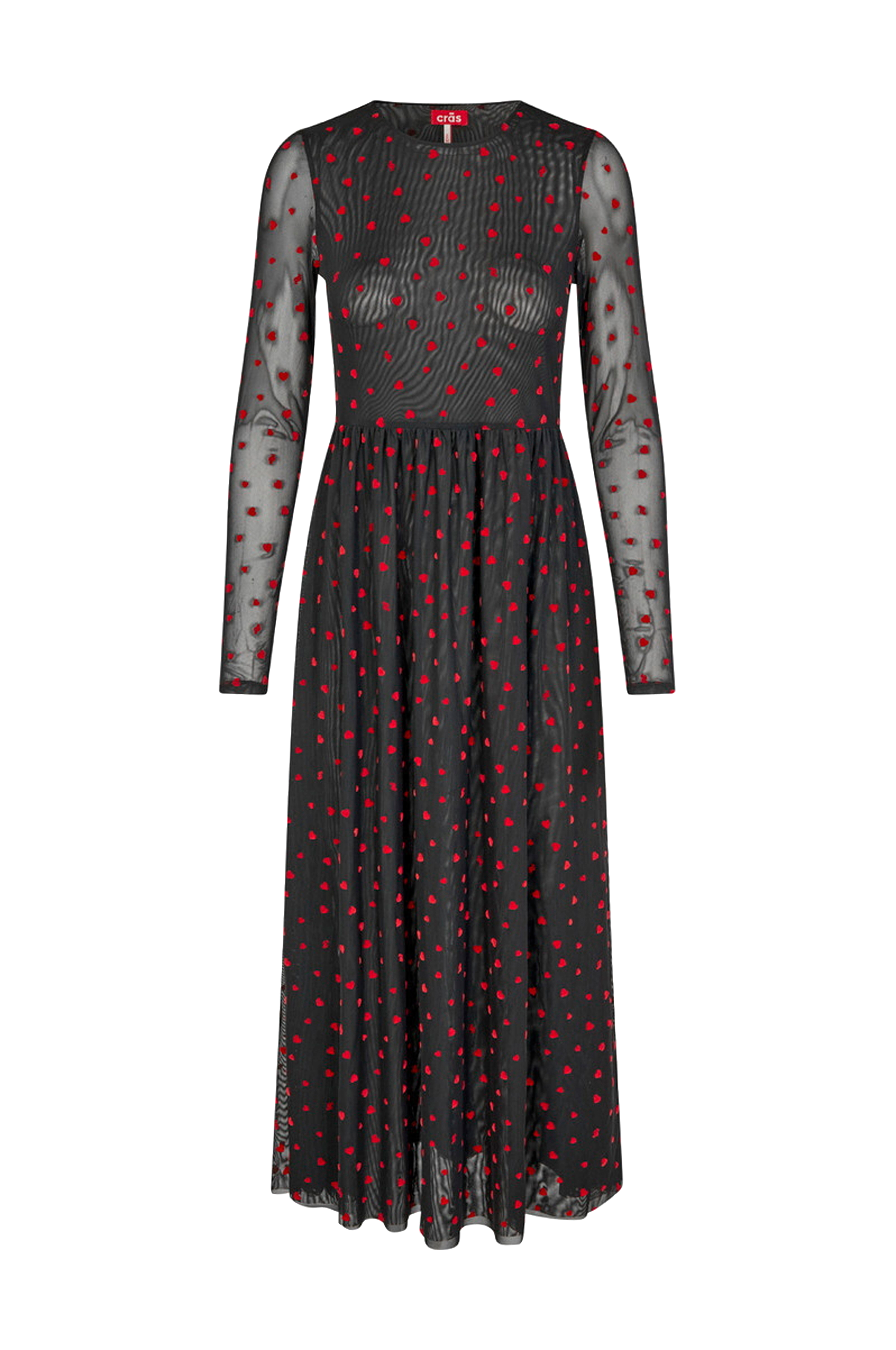 • Lang model med svaj i mesh med røde hjerter i fløjl• Rund hals• Langt ærme• Defineret, rynket talje• Tynde skulderpuder• Foret• Længde: 135 cm i størrelse 36