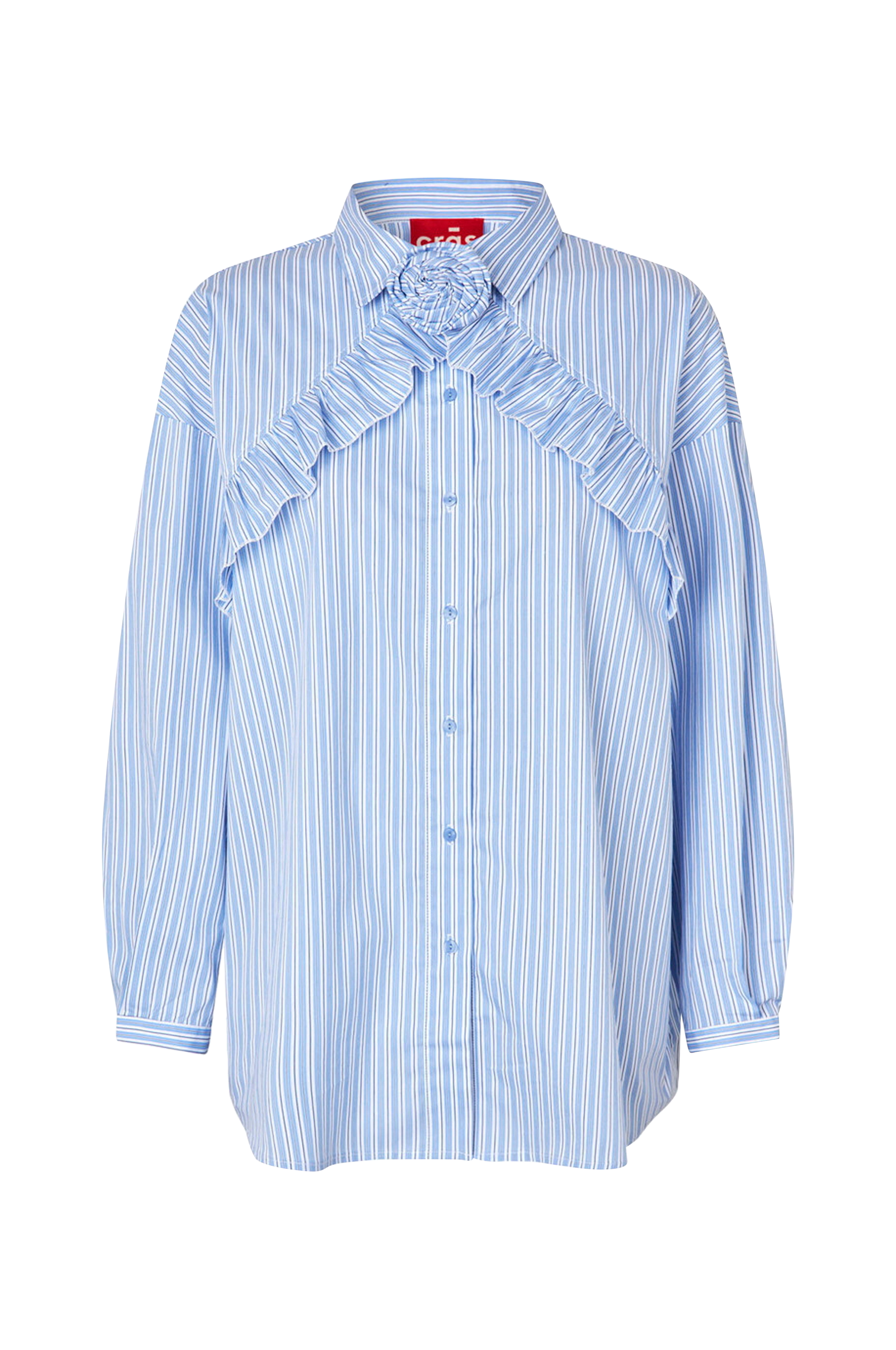 • Lige oversize model• Lille krave• Påsyet volant foran, bagpå og på ærmerne• Aftagelig brosche• Langt ærme med tynd manchet• Let afrundet søm