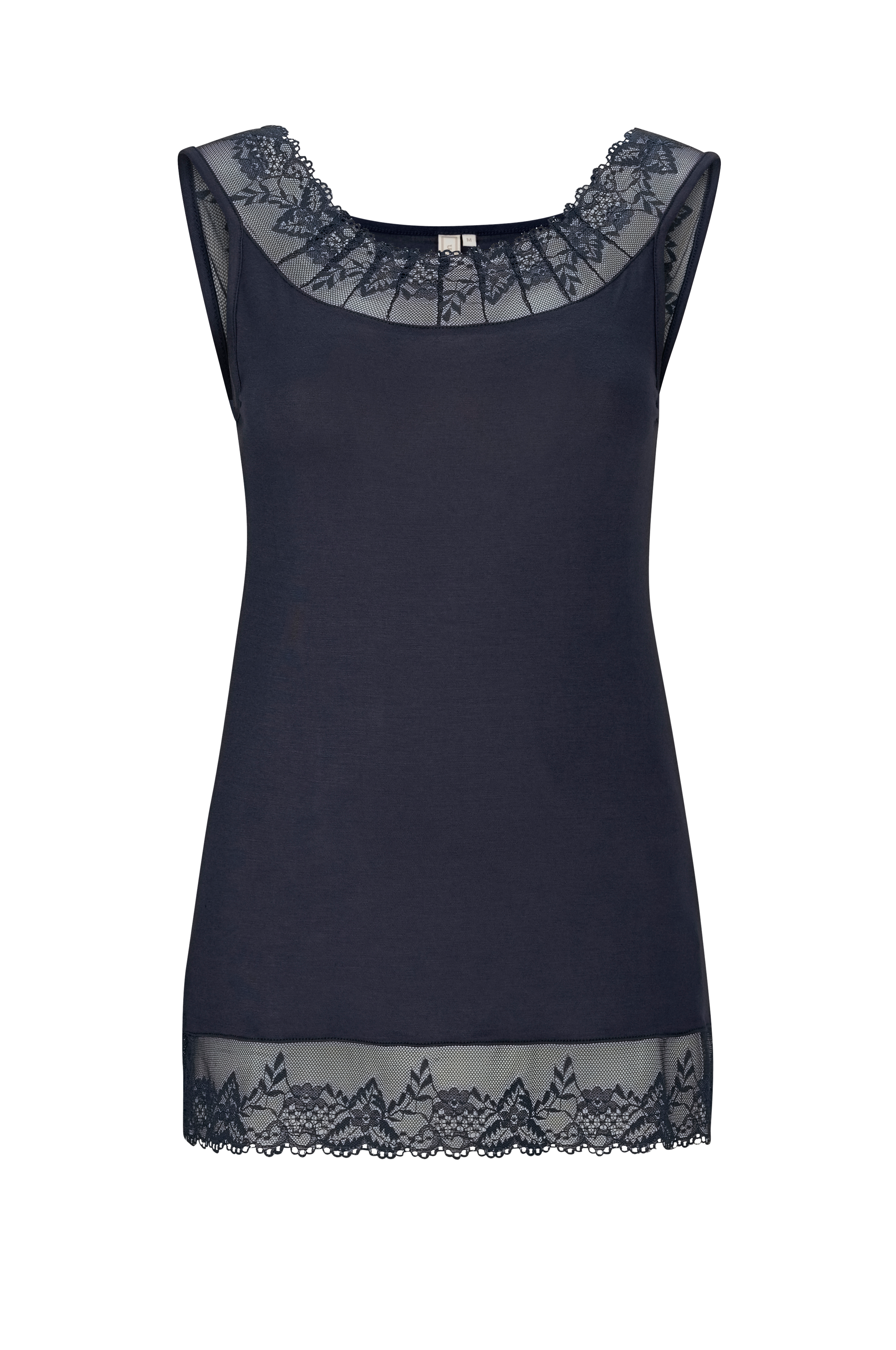 Ærmeløs top Florence fra Cream i blød jersey med bred blondekant forneden og langs halsudskæringen foran. Slids i siderne forneden. Længde 71 cm i str. M.