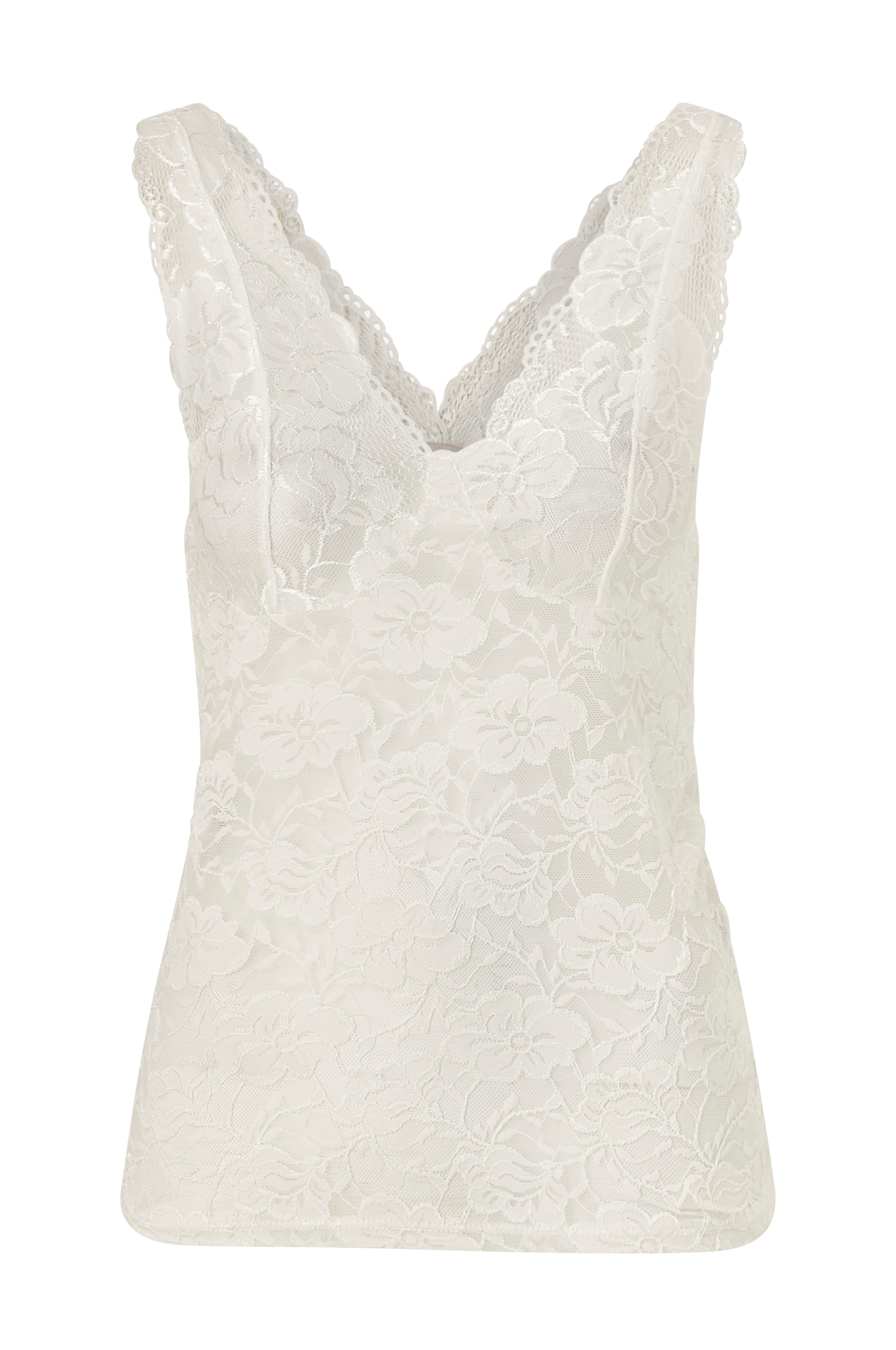 Blondetop Glaze Long Top fra Cream i tynd, transparent blonde med stretch. V-udskæring både foran og bagpå.