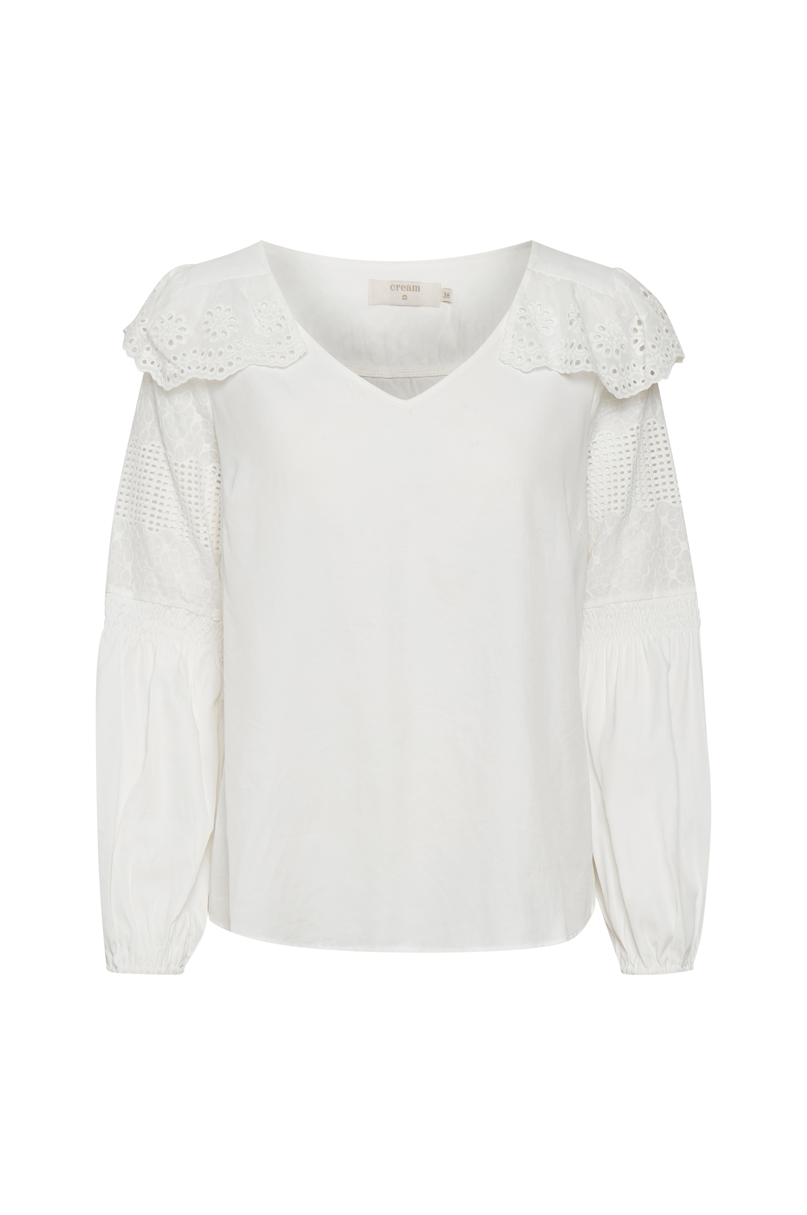 Bluse i vævet kvalitet med bl.a. nylon som giver en særlig, glat fornemmelse. V-udskæring foran og bred flæse med romantisk hulbroderi rundt om. Lange ballonærmer med smockelastik og broderi foroven.