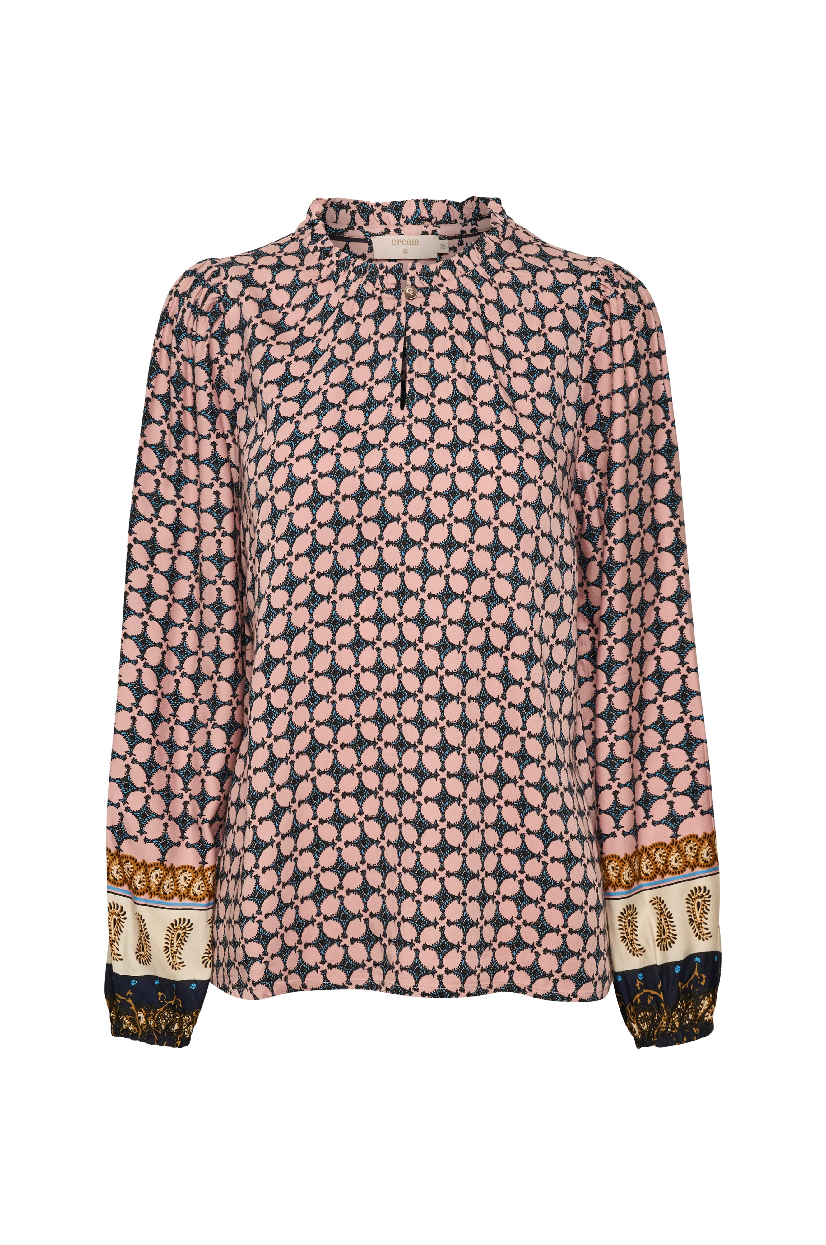 Mønstret bluse i fin viskose. Flæse i hals og slids med knap foran. Lange ærmer med elastiske ærmekanter.