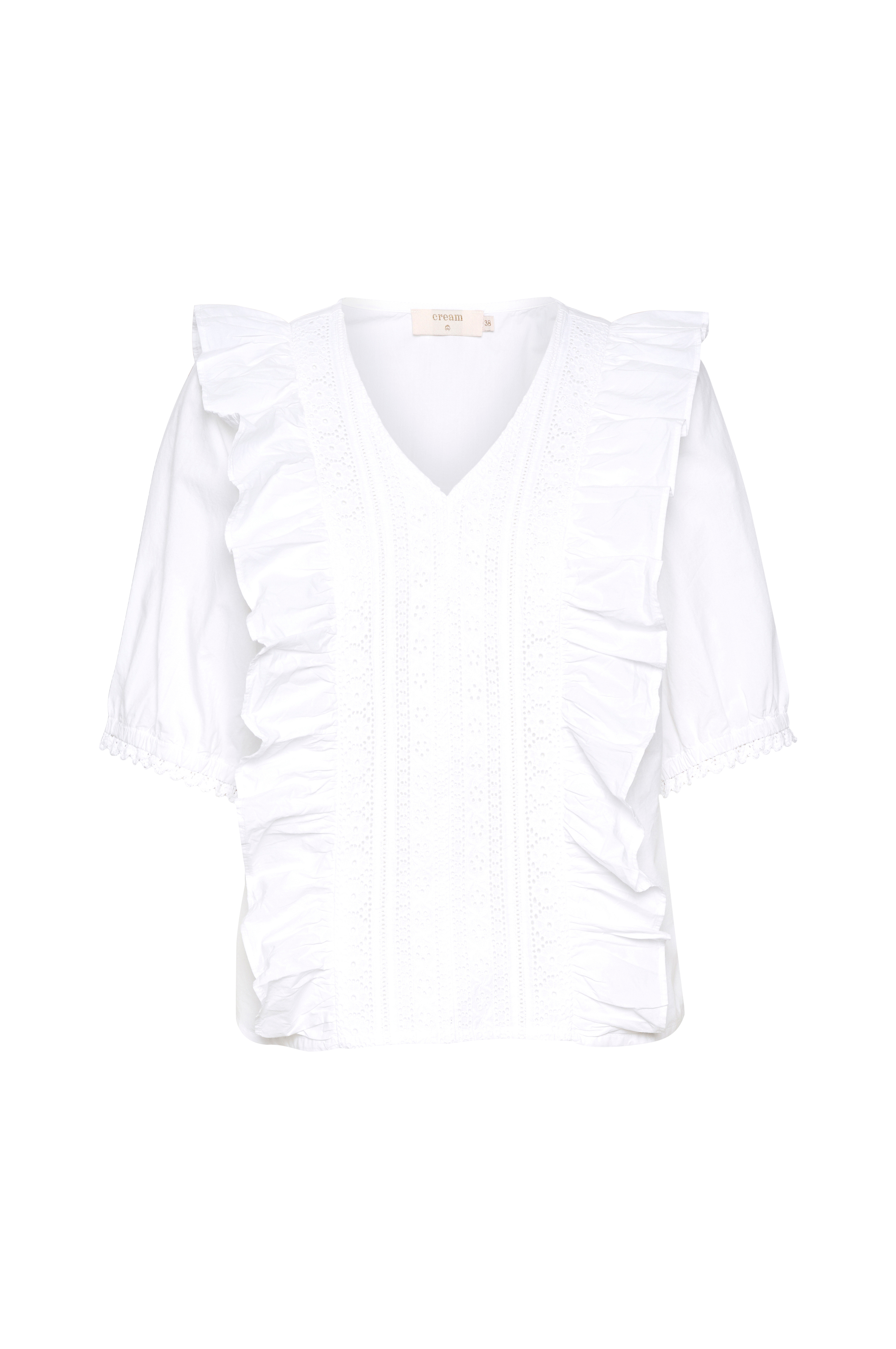 • V-udskæring• Volanter foran og bagpå• Halvlange ærmer med elastik ved manchetterne• Hulbroderi foran