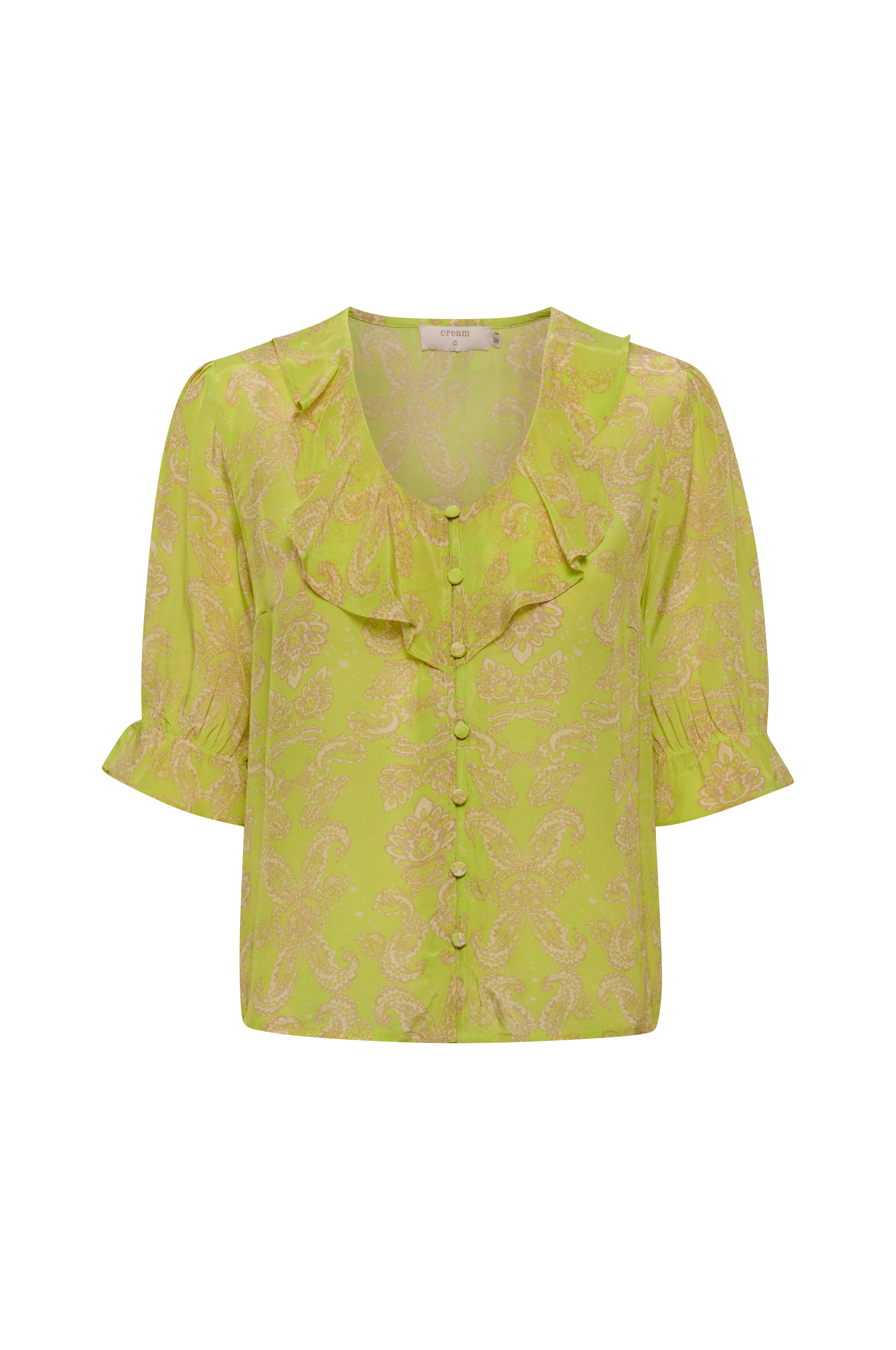 • Knapper foran• Volant i halsen• 3/4 lange ærmer med volant• Tynd kvalitet med glans