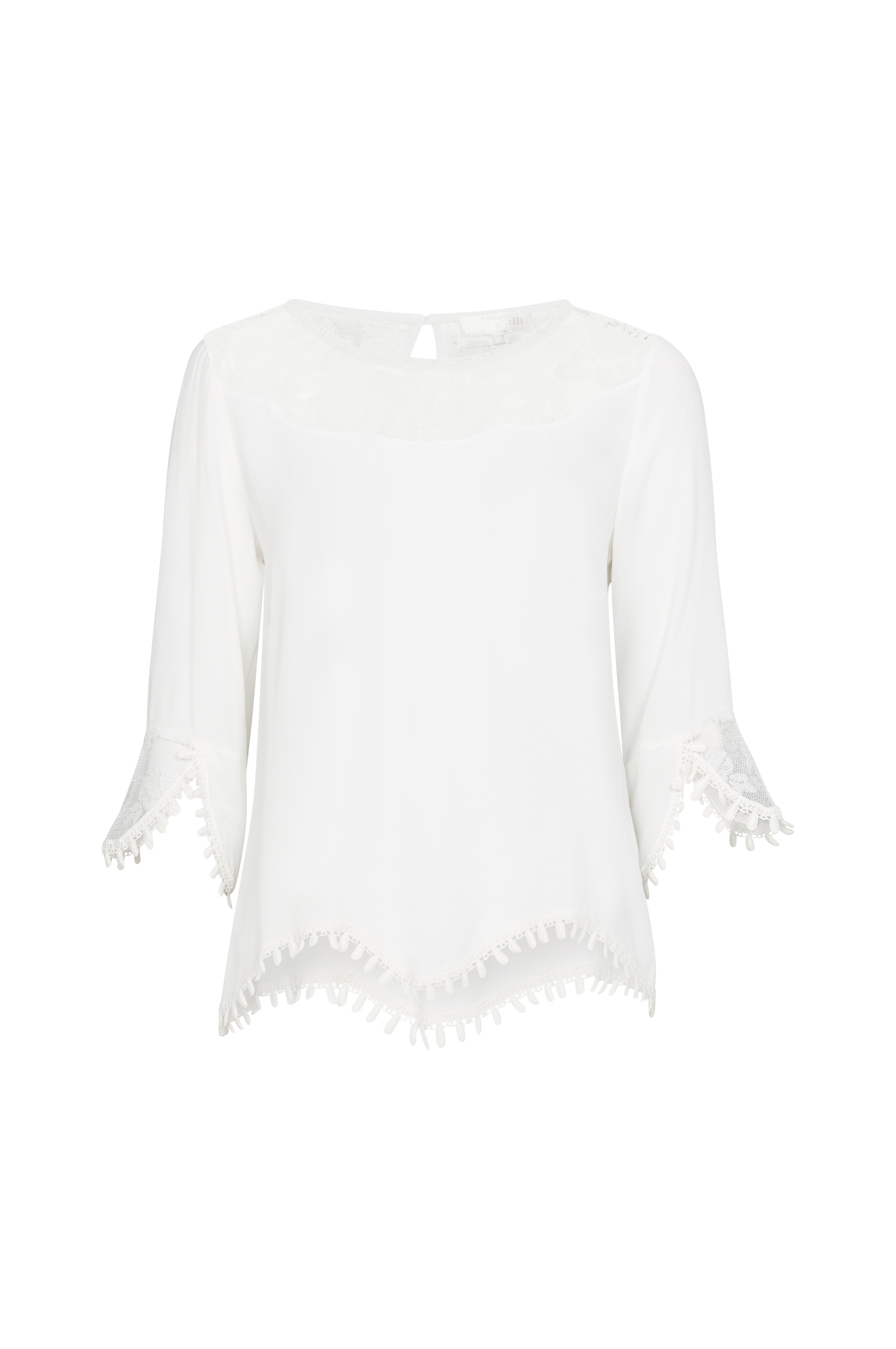 Bluse Kalanie Blouse fra Cream. Lige model med afslappet form og bølgeskåret bærestykke i gennembrudt blonde. Rund hals med slids og knap i nakken. 3/4-langt ærme med afrundet indsats i stof og blonde med dobbelt slids og påsyet blondekant. Også påsyet blondekant i den bølgeskårne kant forneden. Vævet crepekvalitet. Længde bagpå ca. 68 cm i str. 36.