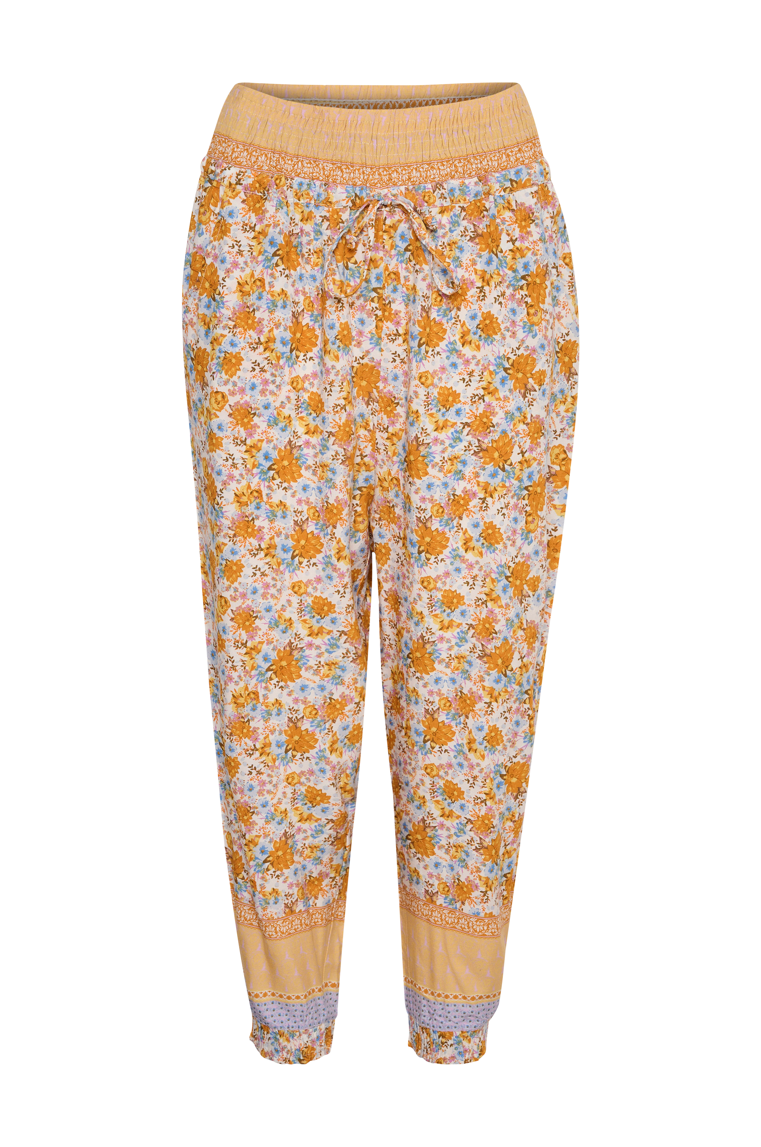 Læglange bukser med vid pasform over lårene og bukseben, der bliver lidt smallere nedefter. Bred smock i taljen samt justerbar løbegang for perfekt pasform. Lommer i siderne og elastik i benkanten. Benlængde ca. 59 cm i str. 36.