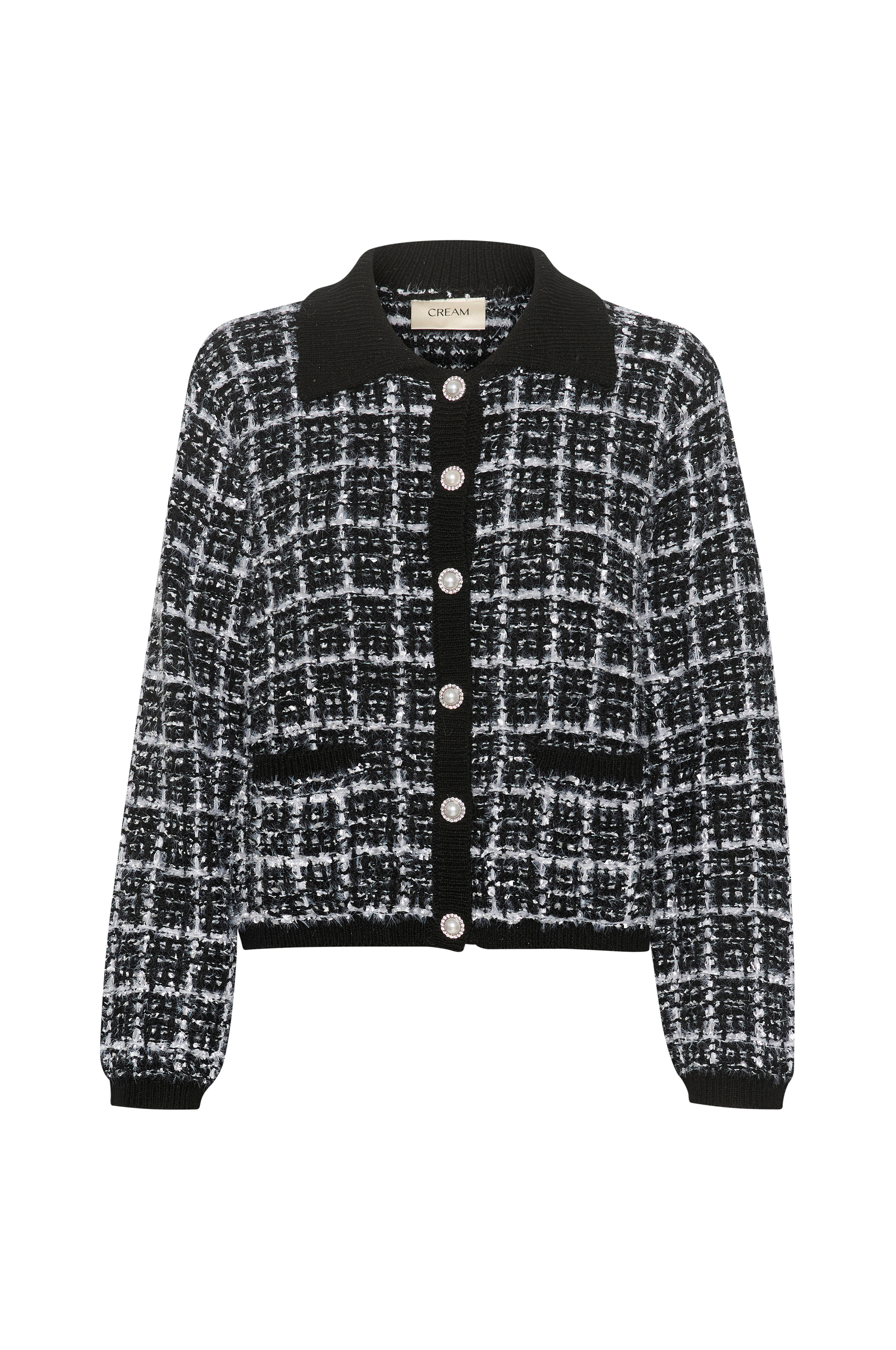• Mønstervævet model• Ribstrikket krave• Dekorative, glitrende knapper• To små lommer• Ribstrikkede, smalle kanter