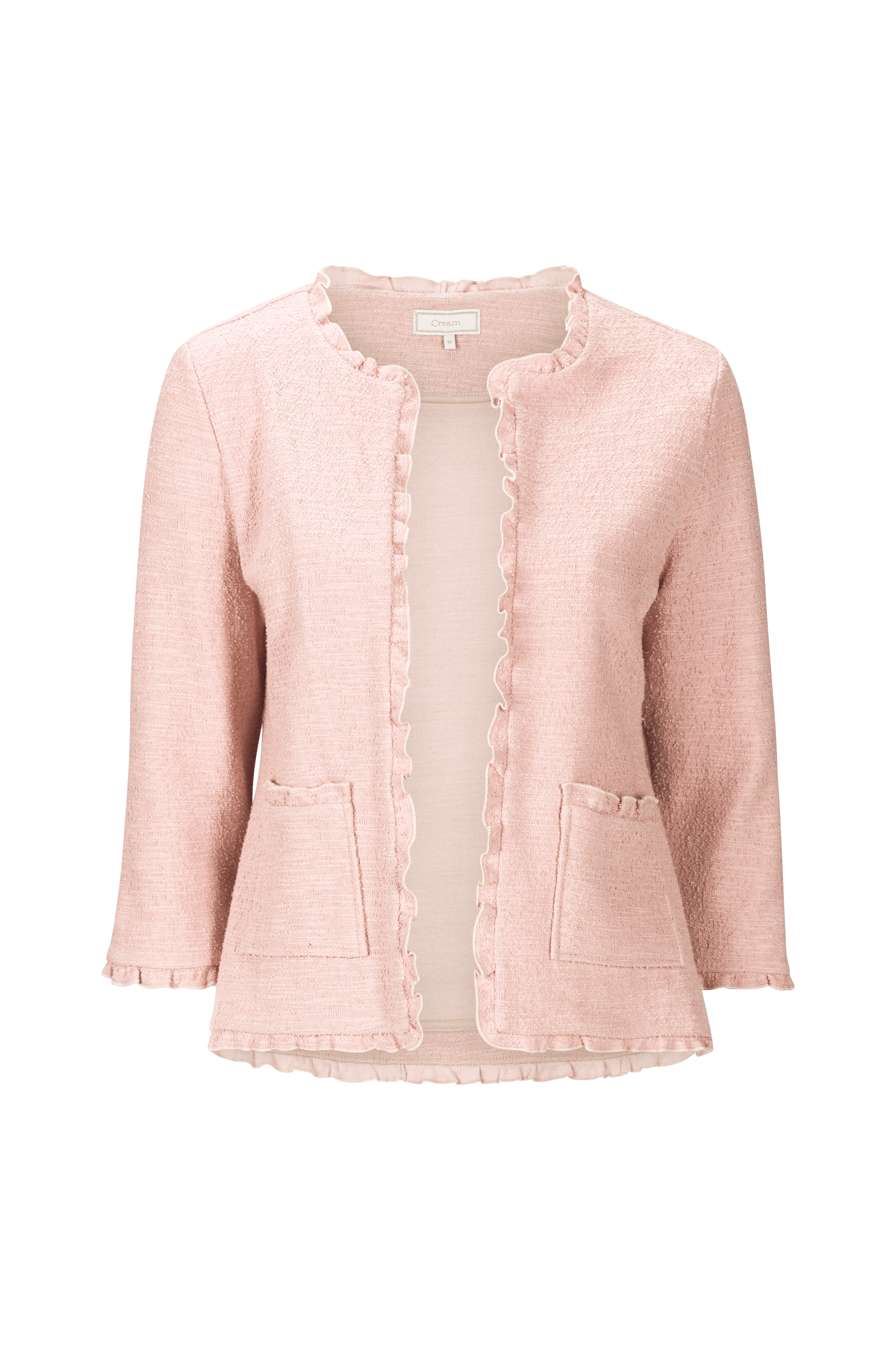 Cardigan Nellie fra Cream er en sød lille indendørsjakke/cardigan uden lukning med flæsekant samt to påsyede forlommer. Ærmerne er lidt kortere med smal flæsekant i ærmekant. Fremstillet i vævet bomuldskvalitet med sweattouch, hvor ydersiden er fint nopret. Indersiden er glat. Længde 58 cm i str. M.