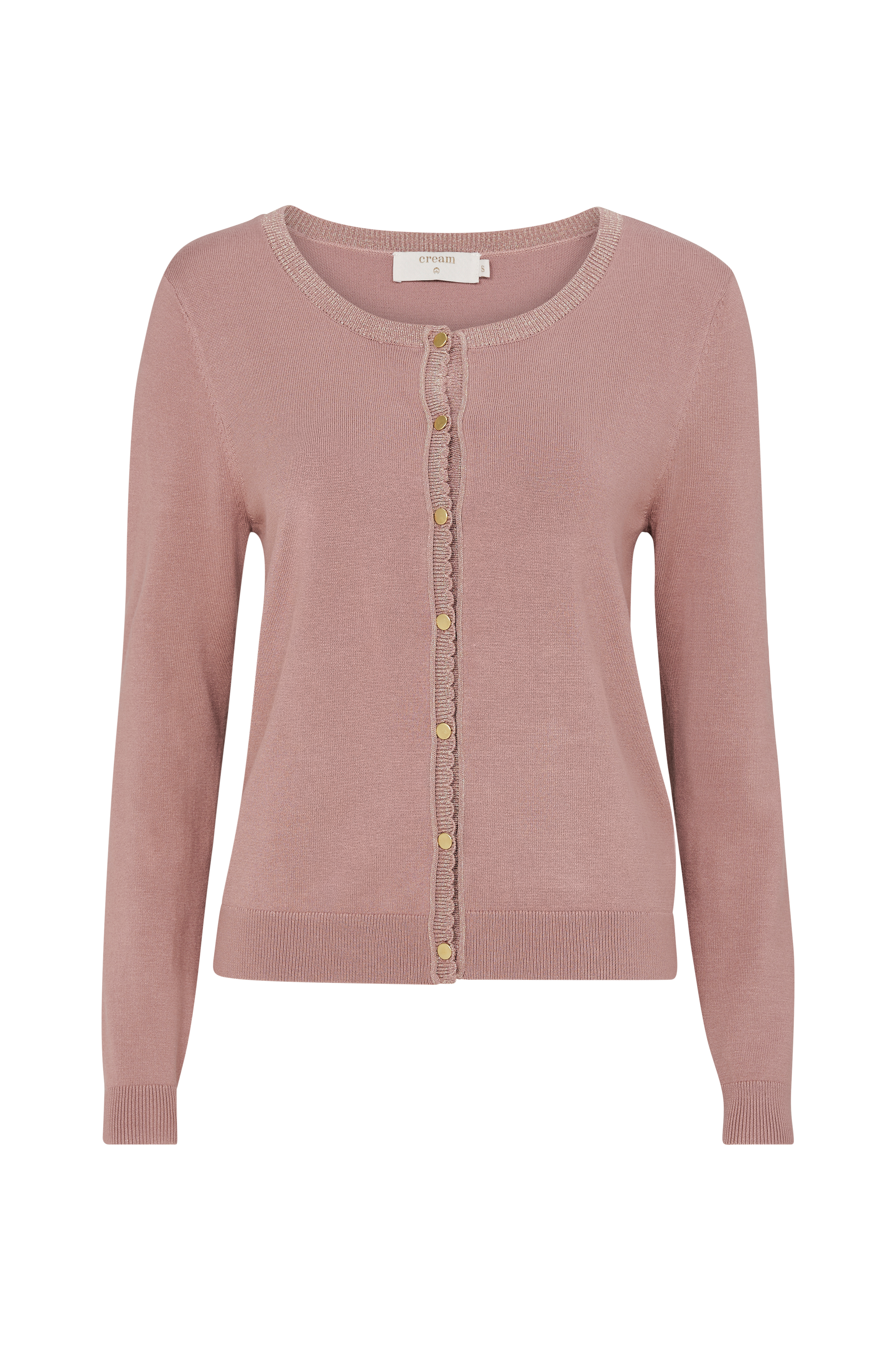 Cardigan Tammy fra Cream. Fintstrikket model med vid halsudskæring og forkant, som har ribstrik med indvævet guldtråd. Også ribstrikket ærmekant og kant forneden. Længde ca. 60 cm i str. S.