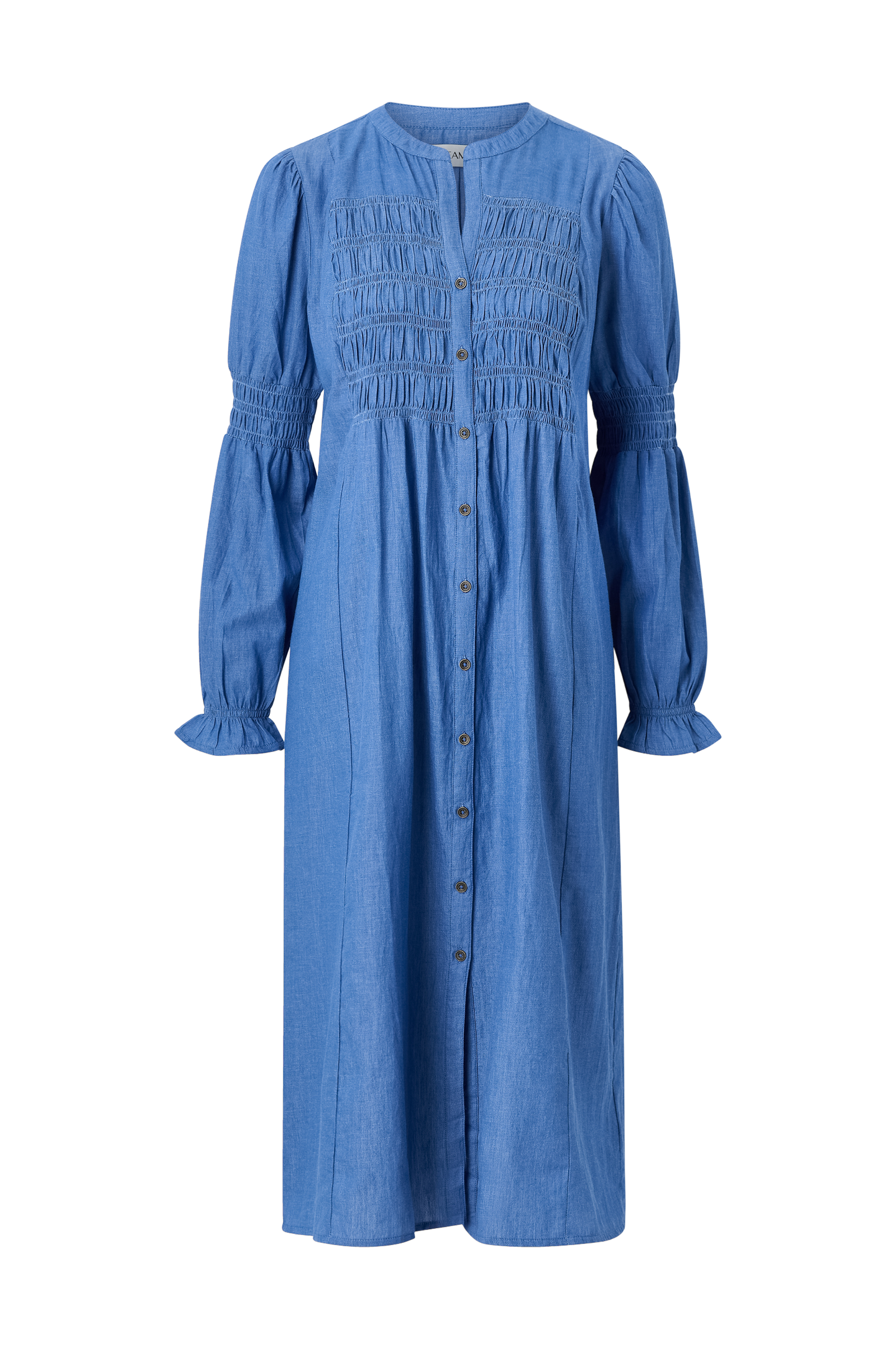 • Midikjole i tynd, blød bomuldsdenim• Rund halsudskæring med slids foran• Smock oppe foran og bagpå• Knapper hele vejen frem• Lange pufærmer med smock ved albuerne og elastiske ærmeafslutninger• Længde: 121 cm i størrelse 36