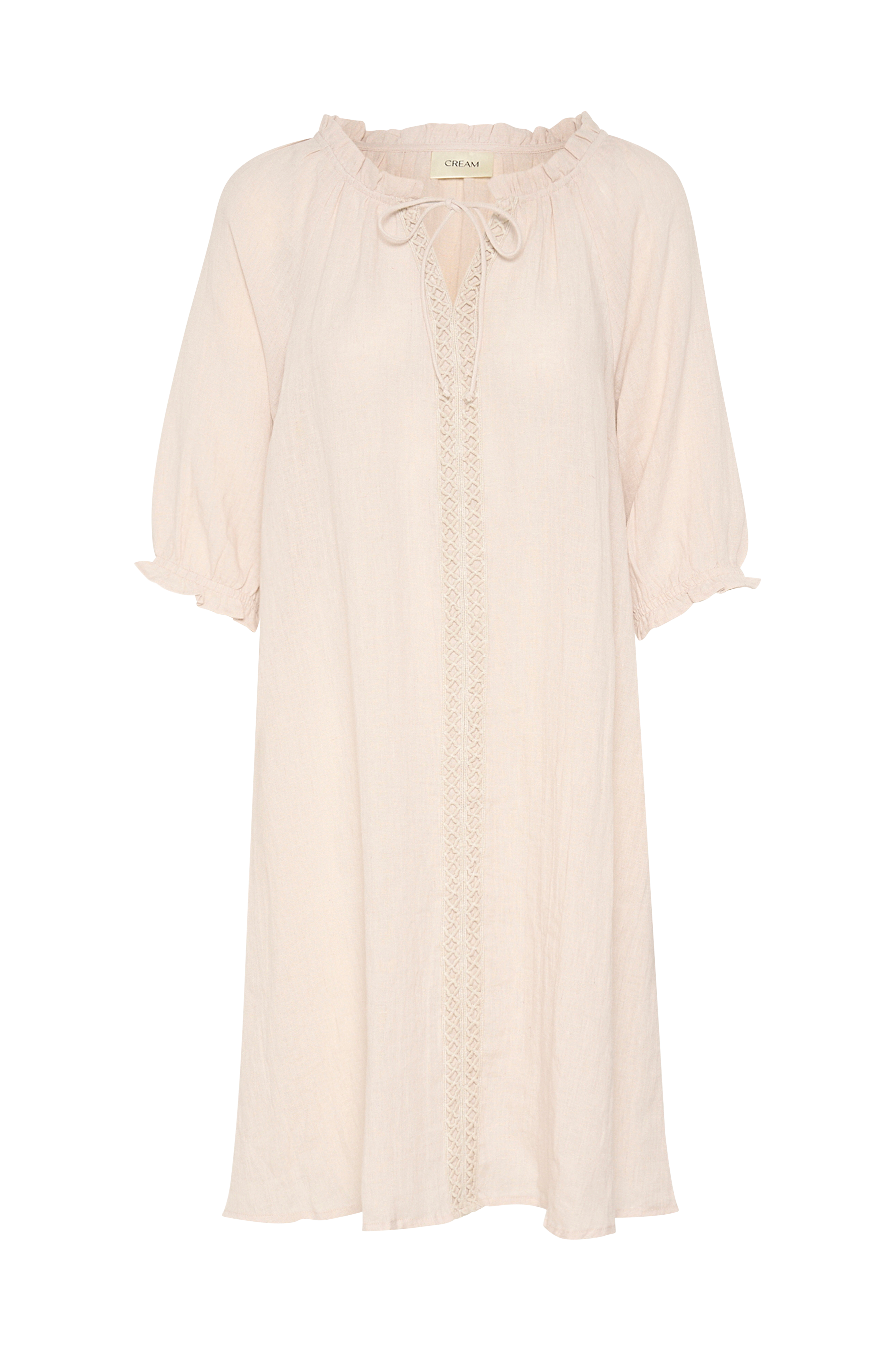 • Model med svaj• Rund hals med flæsekant og bindebånd foran• Broderier midt foran• Kort, raglan-skåret ærme med elastik nederst• Sidelommer• Længde: 104 cm i størrelse S/M