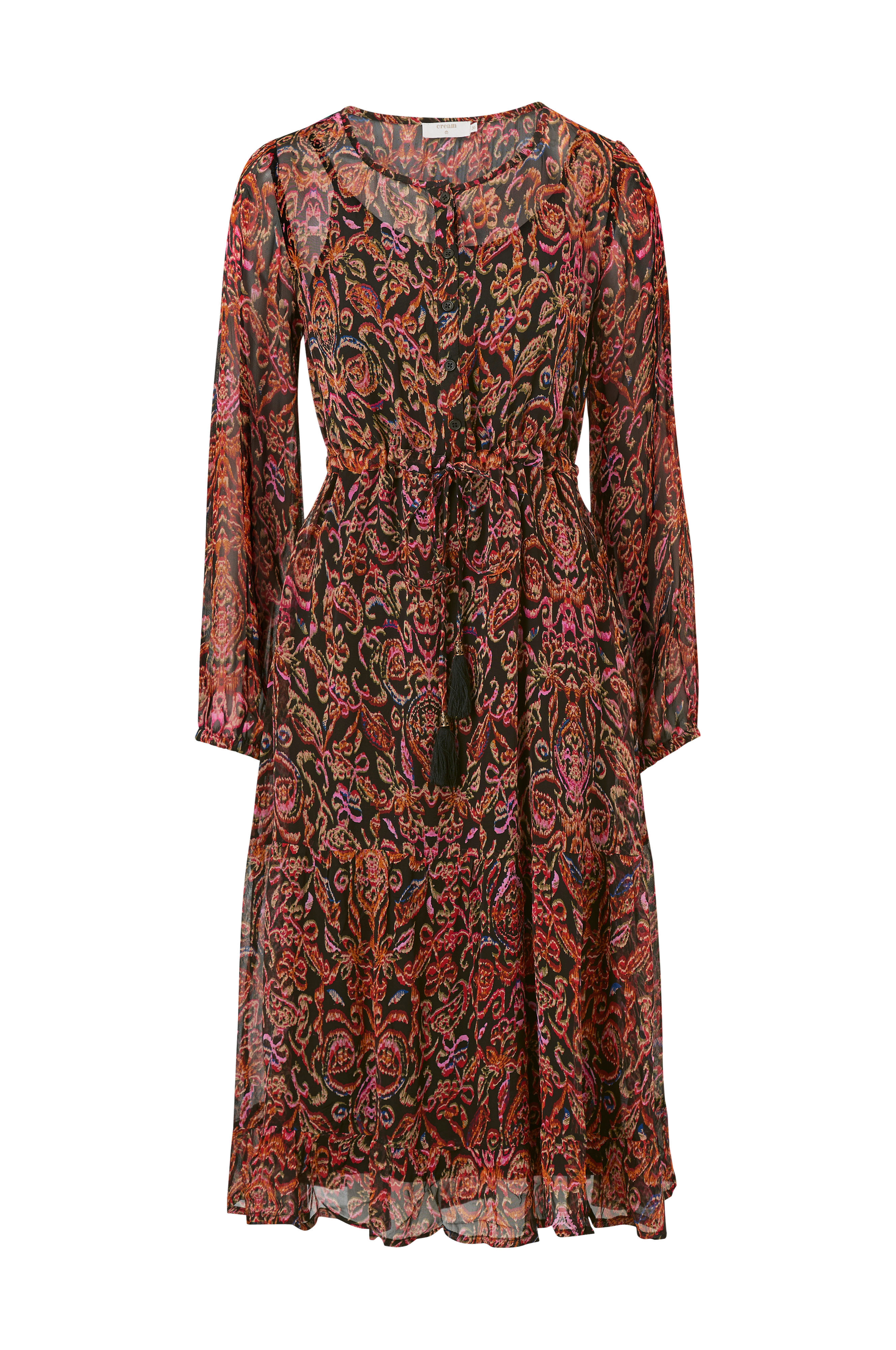 Kjole crGitte Dress fra Cream. Model i mønstret chiffon med afskæring og indsat løbegang med bindebånd i taljen. Rund hals med smal kant og stolpelukning foran ned til taljen. Vide ærmer med indsat elastik i ærmekanterne og vidde i underdelen med påsyet flæse i kanten forneden. Udtagelig underkjole i jersey som har smalle, regulerbare skulderstropper. Længde ca. 119 cm i str. 36.