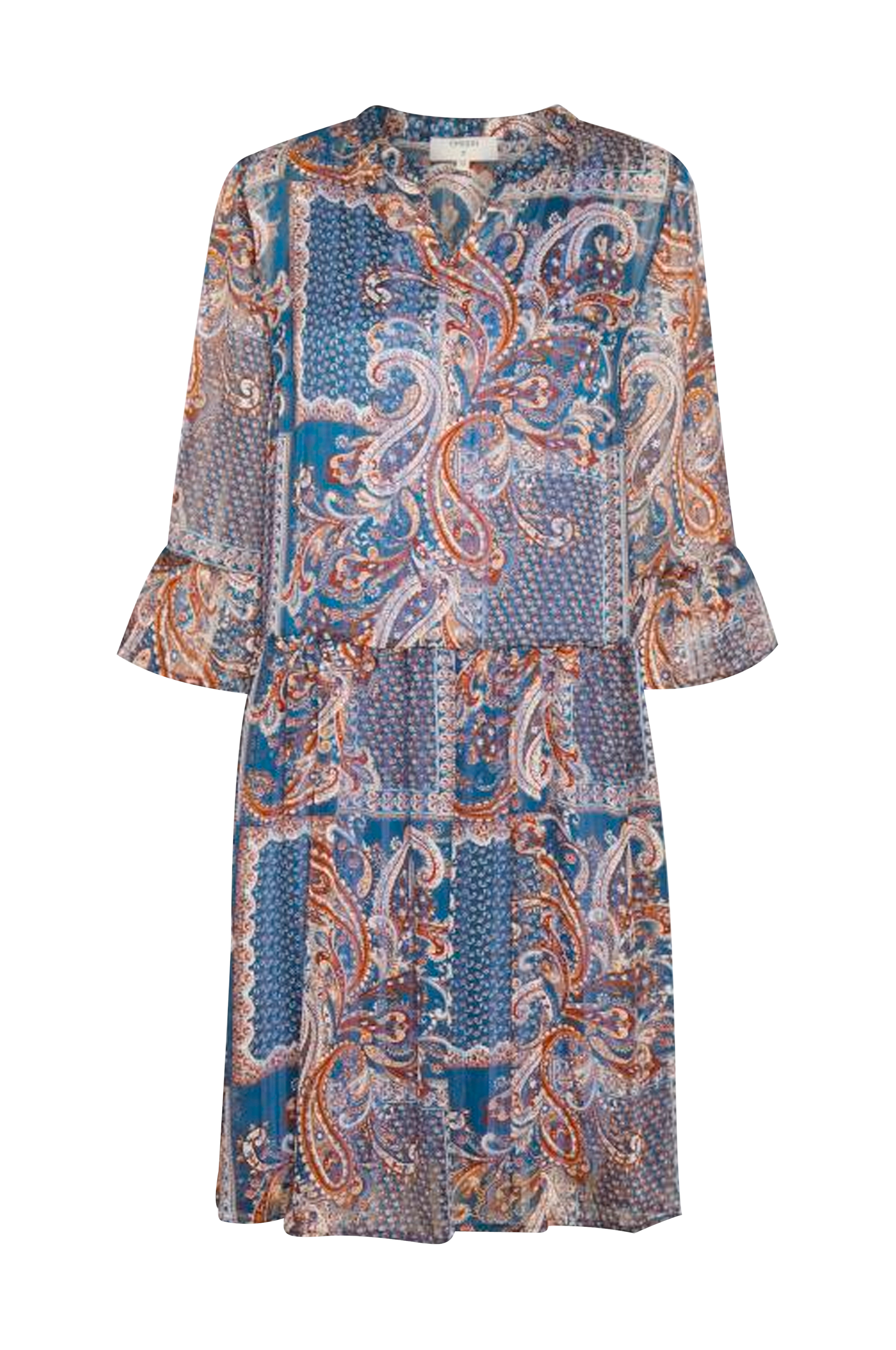 Kjole i tynd, mønstret chiffon med diskret glittertråd. V-udskæring foran, rynket talje og 3/4-lange ærmer med flæse i ærmekanten. Aftagelig underkjole i jersey. Længde ca. 97 cm i str. 36.