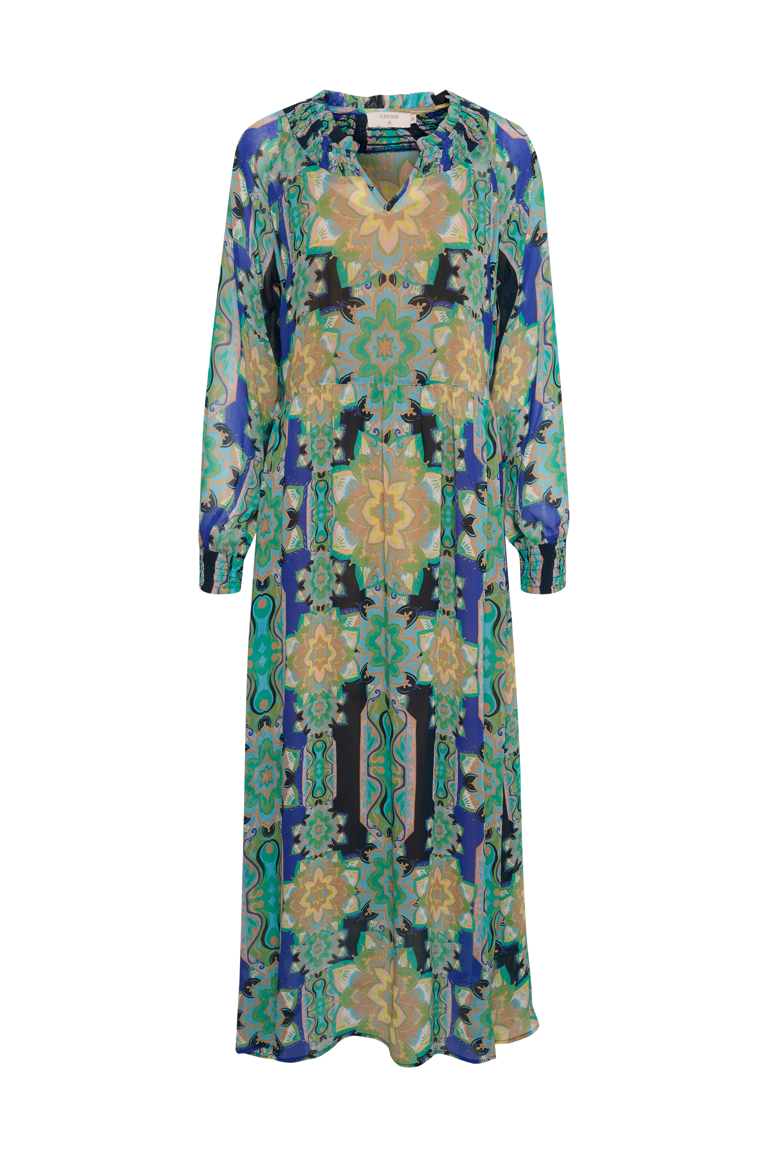 • Lang kjole i mønstret chiffon • Smocket halsudskæring med v-udskæring foran • Transparente ærmer med smock ved manchetterne • Elastik bagpå ved taljen • Underkjole i jersey • Længde: 133 cm i størrelse 36