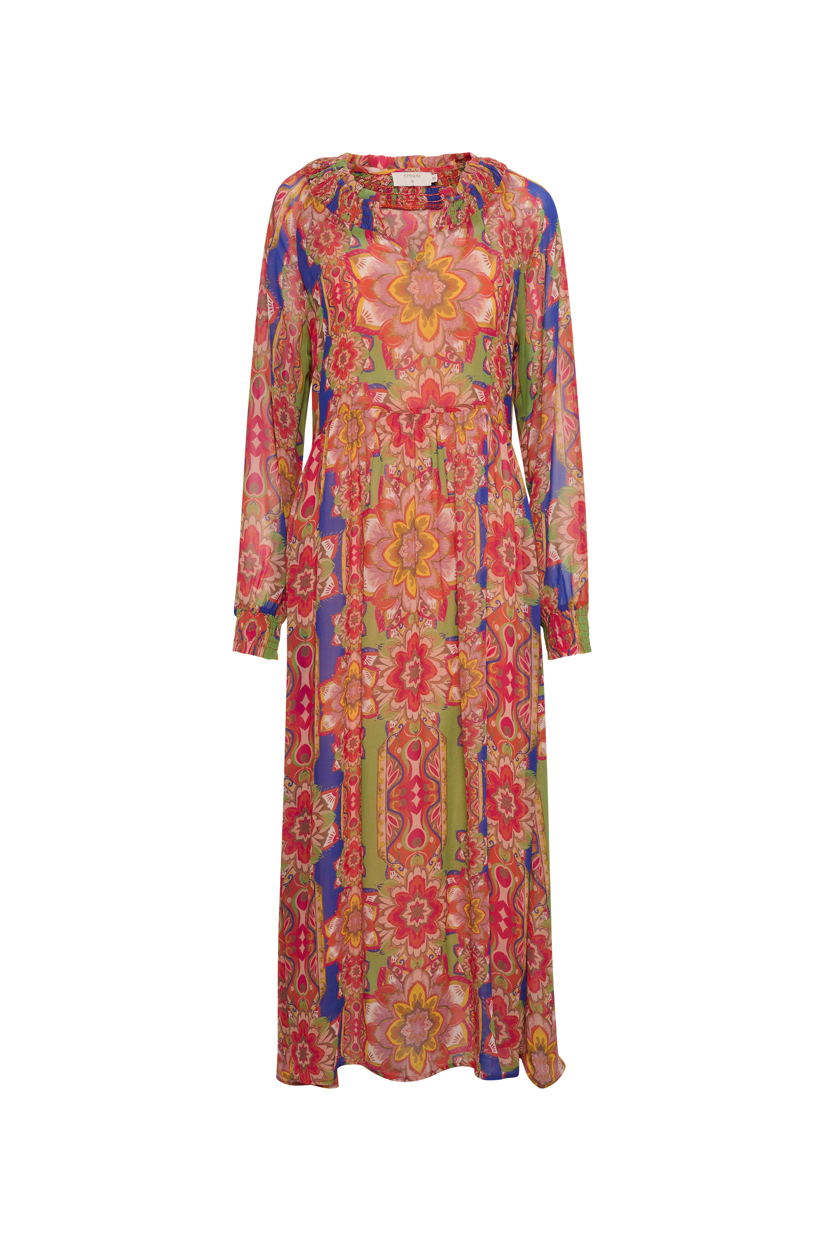 • Lang kjole i mønstret chiffon • Smocket halsudskæring med v-udskæring foran • Transparente ærmer med smock ved manchetterne • Elastik bagpå ved taljen • Underkjole i jersey • Længde: 133 cm i størrelse 36
