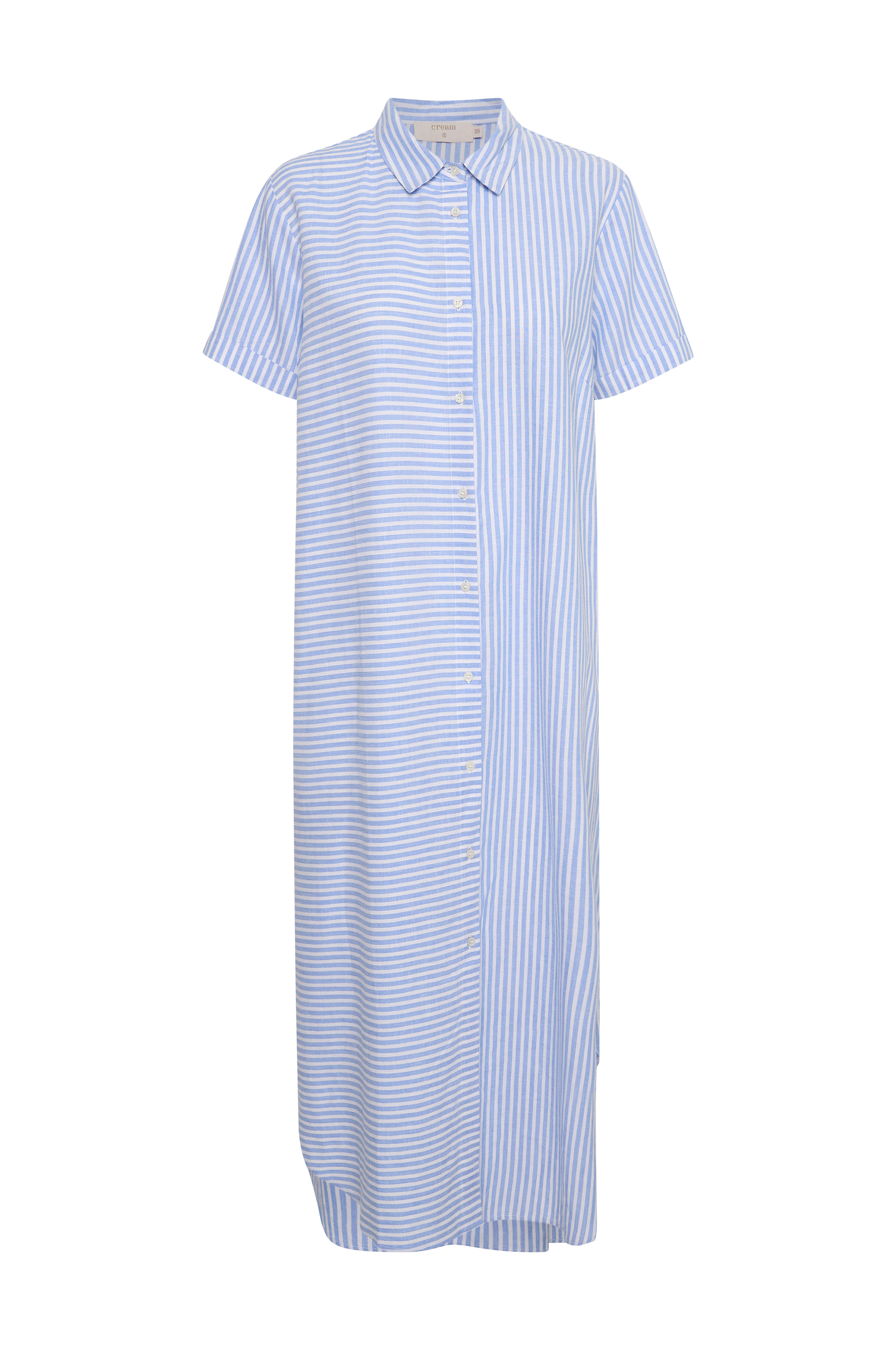 • Skjortekjole med svaj med lille krave• Knapper hele vejen frem• Kort ærme med oprullet• Afrundet søm med ventilationer i siderne• Længde: 128 cm i størrelse 36