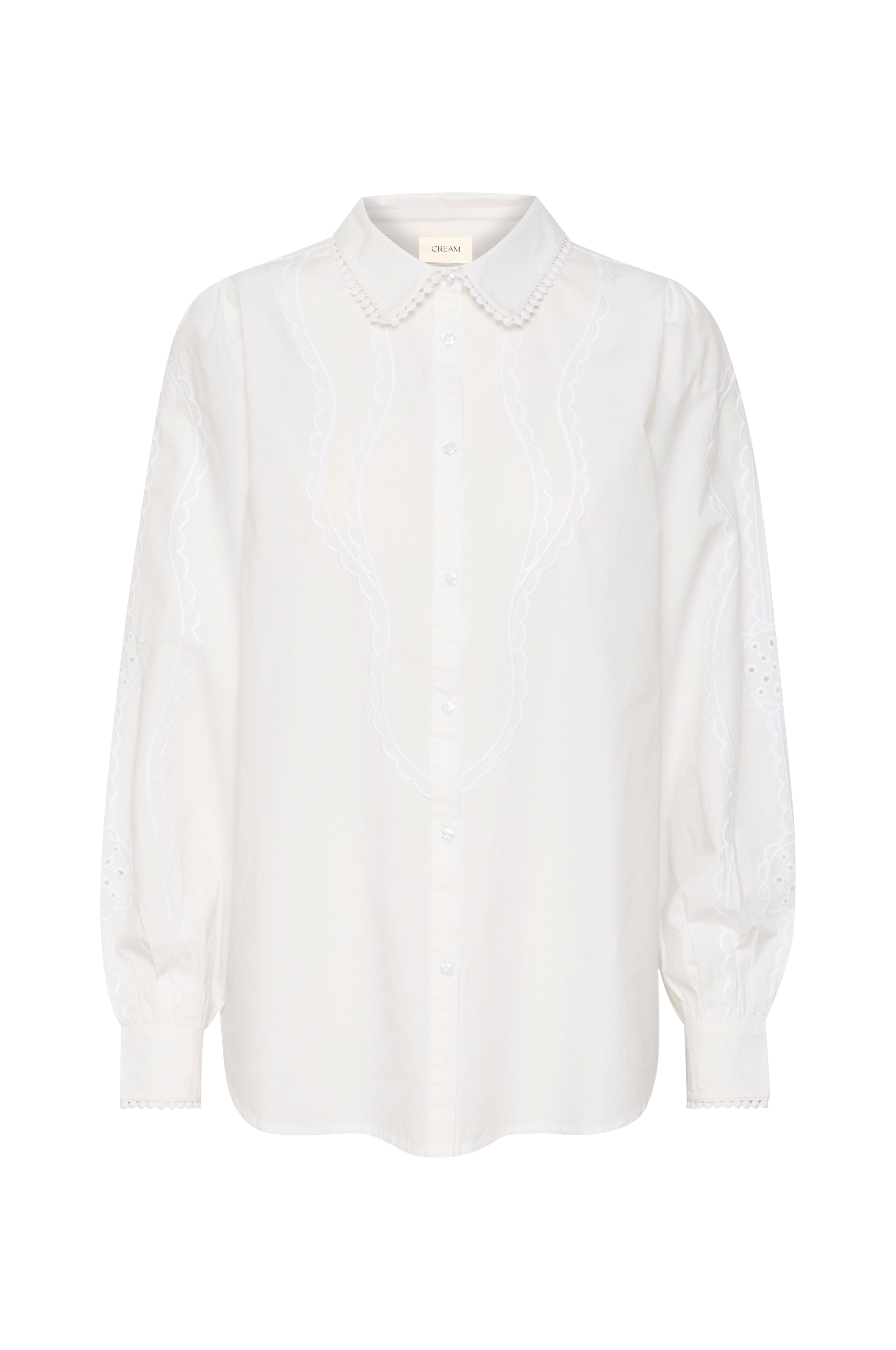 • Model med broderier overalt• Krave med lille blondekant• Knapper foran• Langt ballonærme med manchet• Let afrundet søm