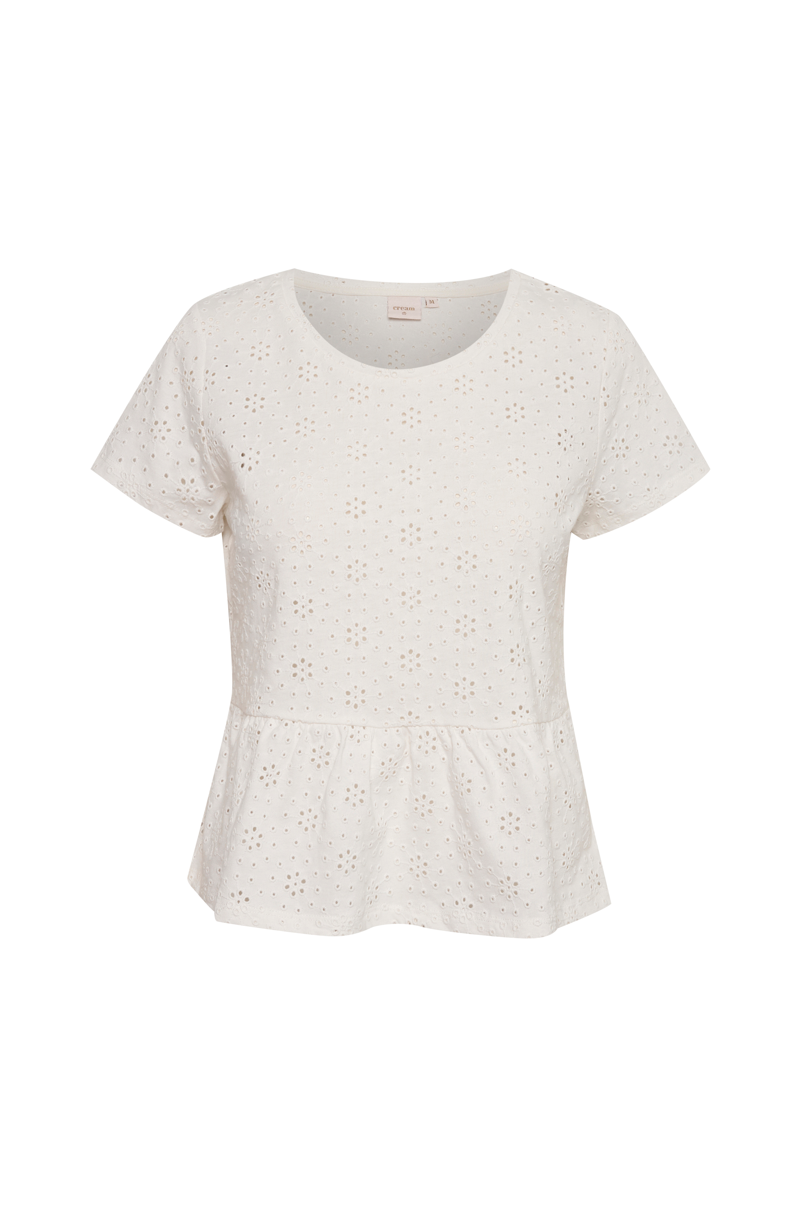 • Peplumdesign• Korte ærmer• Fremstillet af bomuldsjersey med broderet hulmønster