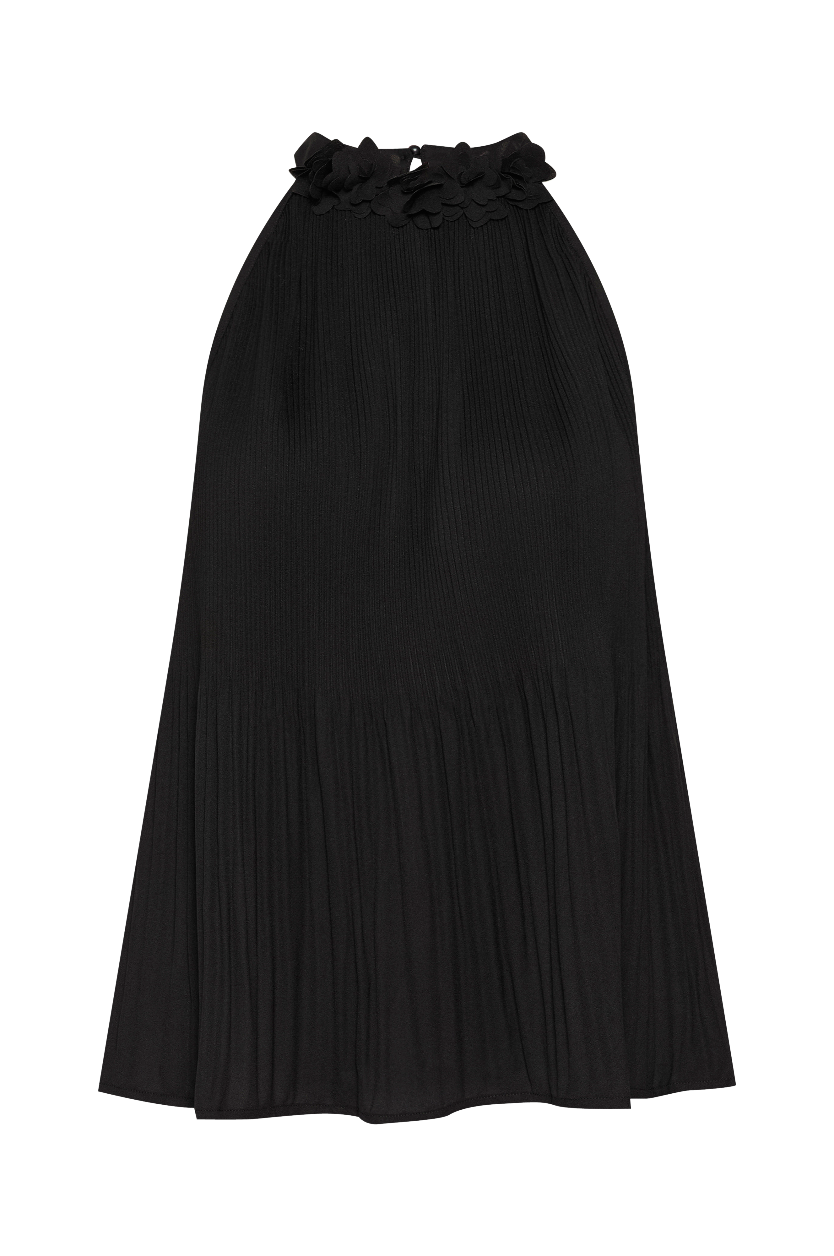 • Ærmeløs, plisseret top• A-linje design• Halterneckdesign• Dekorative blomster i halsen• Ventilation med knap i nakken