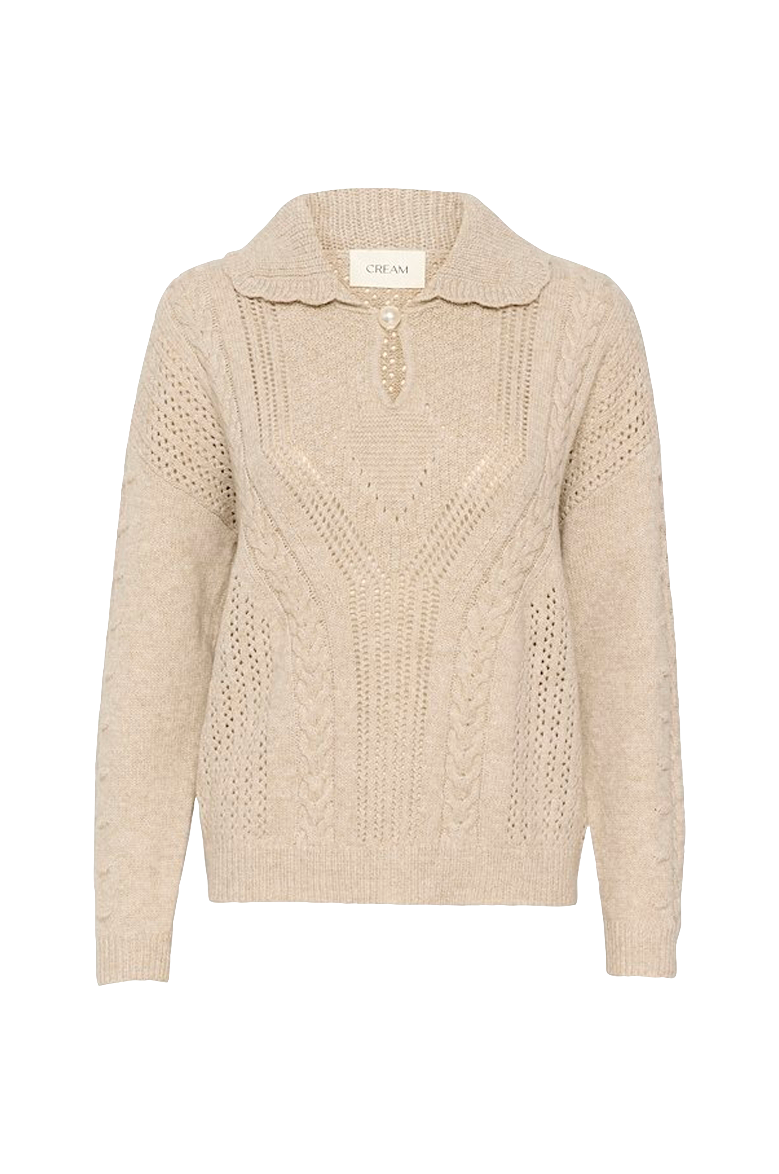 • Mønsterstrikket trøje i bomuldsblanding• Krave• Ventilation med stor perleknap oppe foran• Ribstrik ved manchetterne og nederst