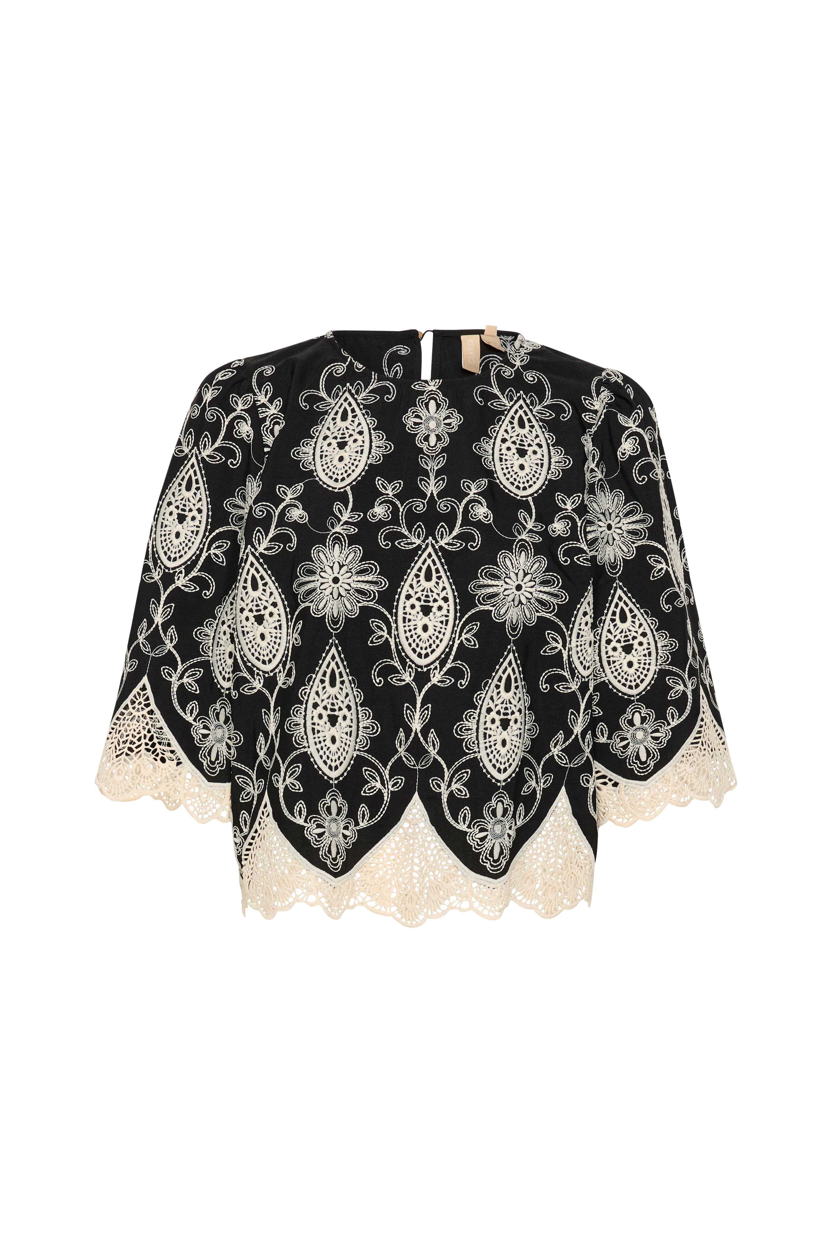 • Lige model med broderier overalt• Rund hals med knap i nakken• Bredt, 3/4 langt ballonærme med blonde ved ærmeafslutningerne• Blonde nederst