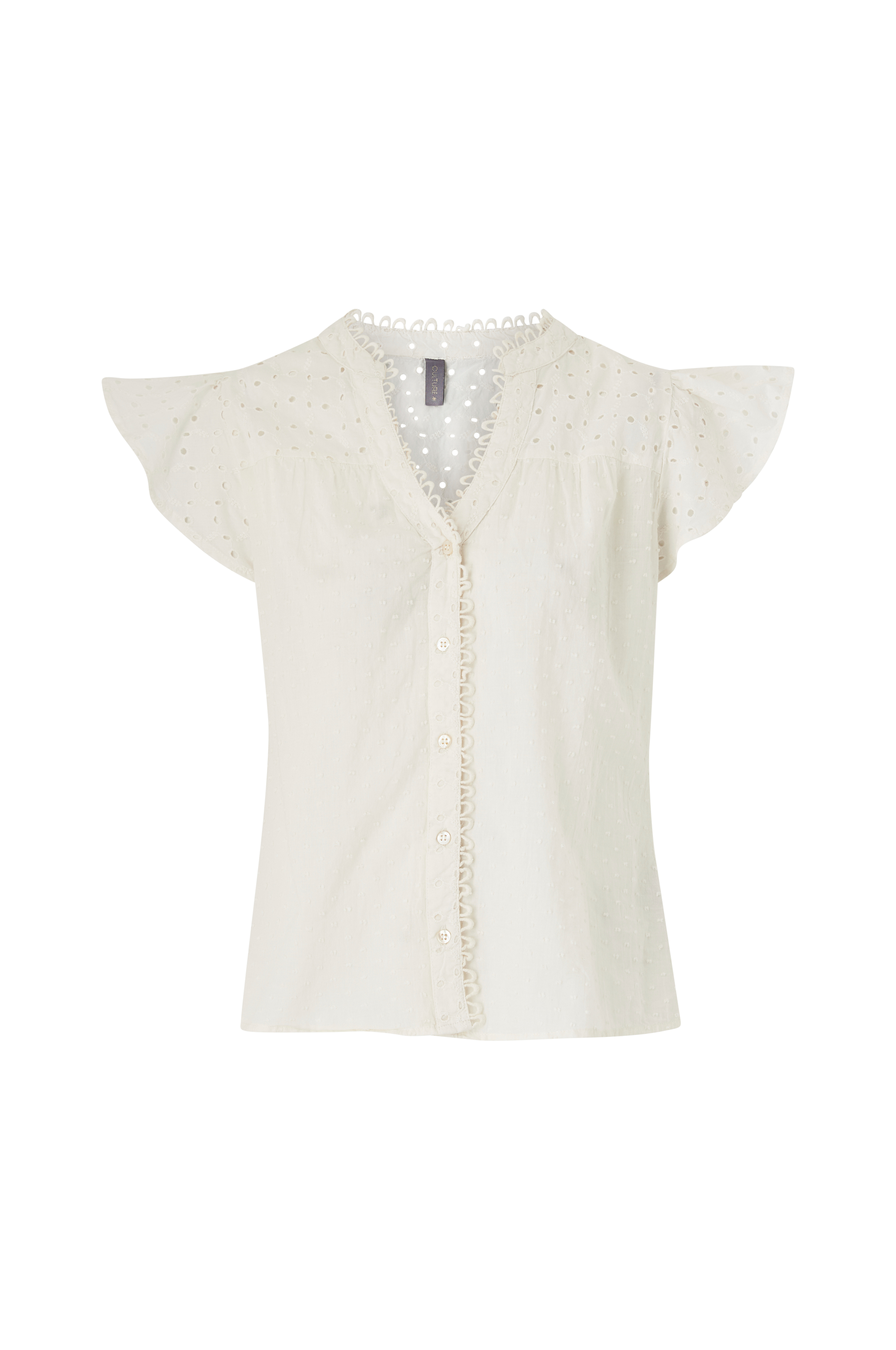 • Mønstervævet model• Hulbroderier på bærekraven• V-udskæring med blondekant• Knapper foran• Kort flagrende ærme