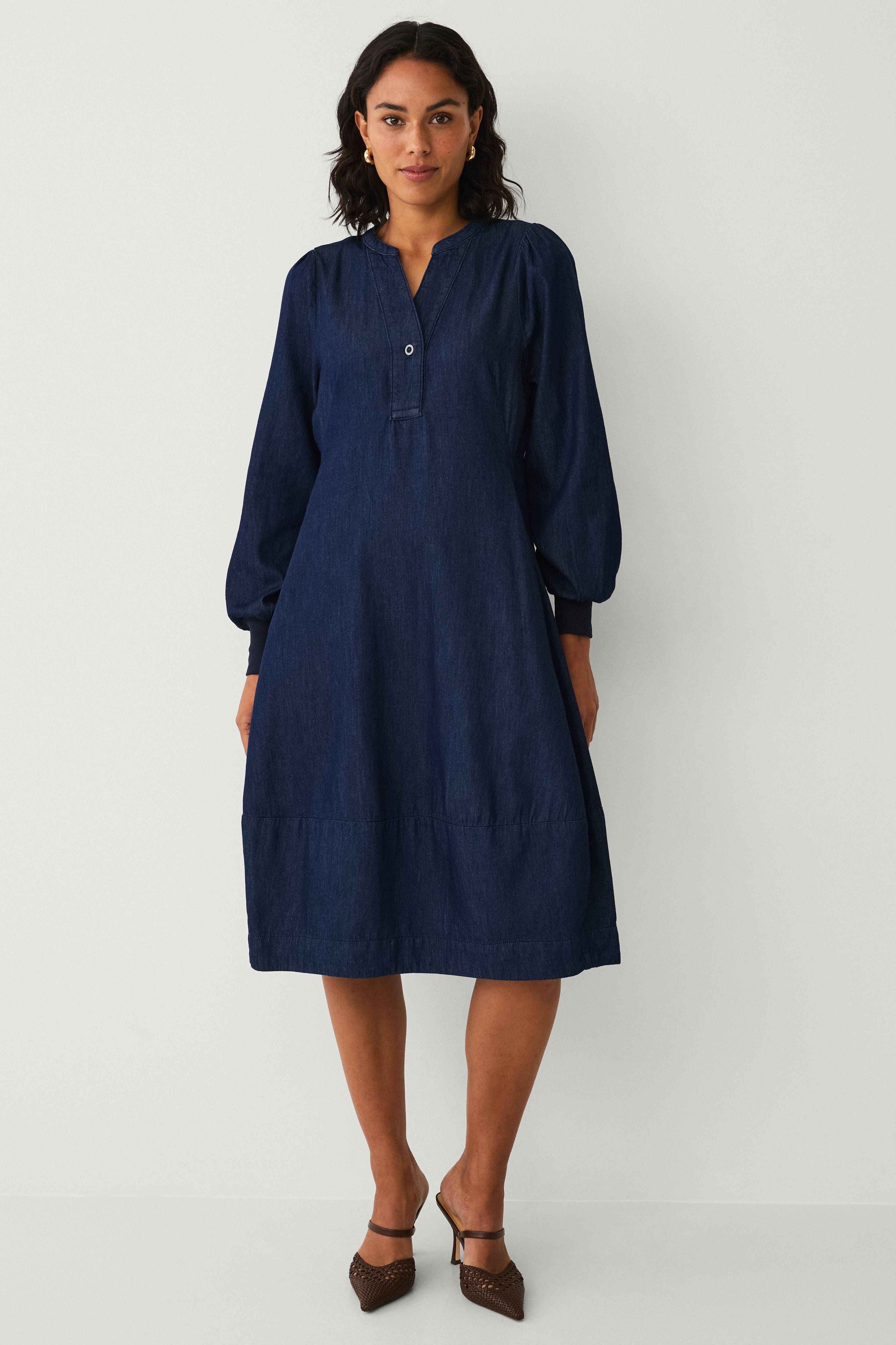 • Kjole i denim• Rund halsudskæring med slids og knap• Lange pufærmer med ribmanchetter ved manchetterne• Sidelommer• Længde: 111 cm i størrelse S